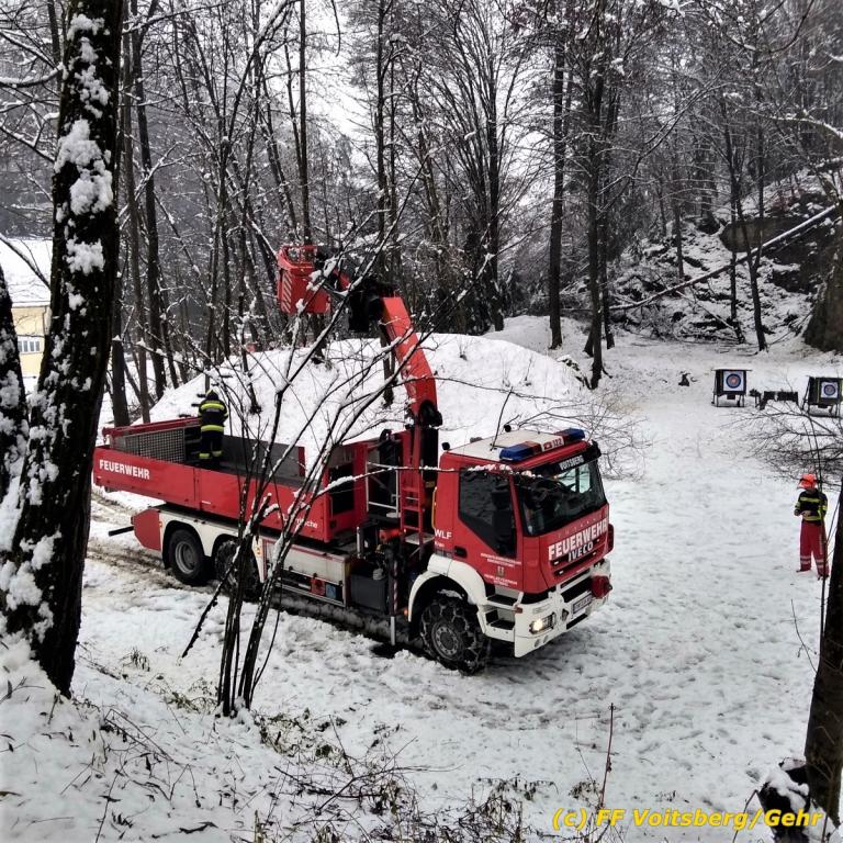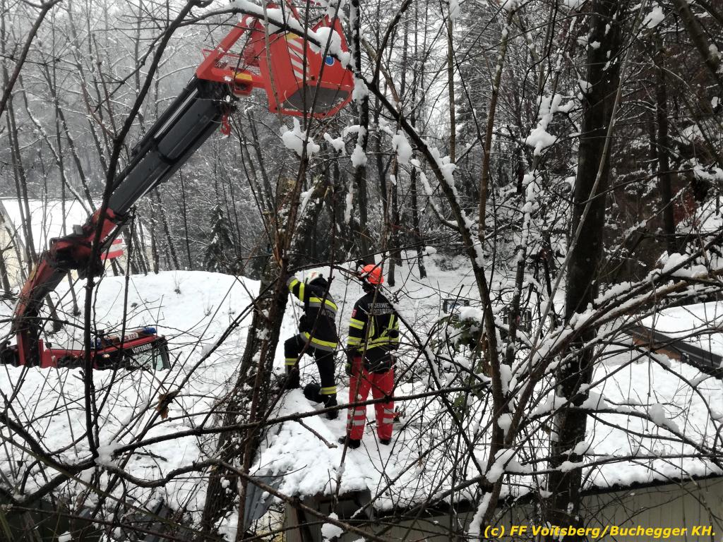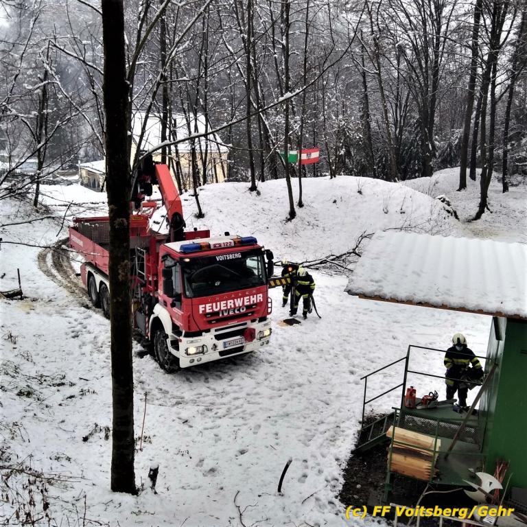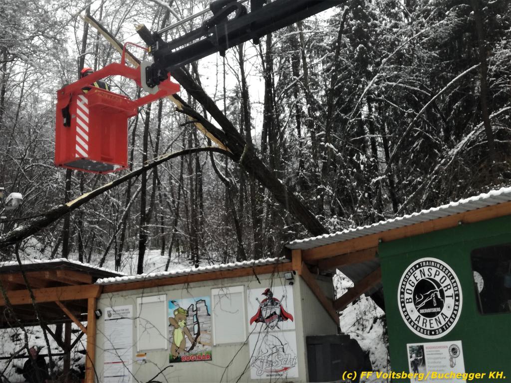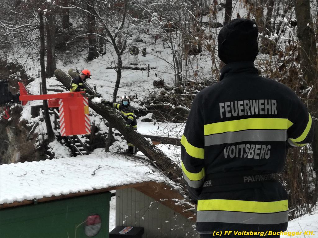 Die alarmierte FF Voitsberg kürzte den Baum unter Verwendung des WLF-Korb scheibchenweise, sodass größerer Schaden verhindert werden konnte.