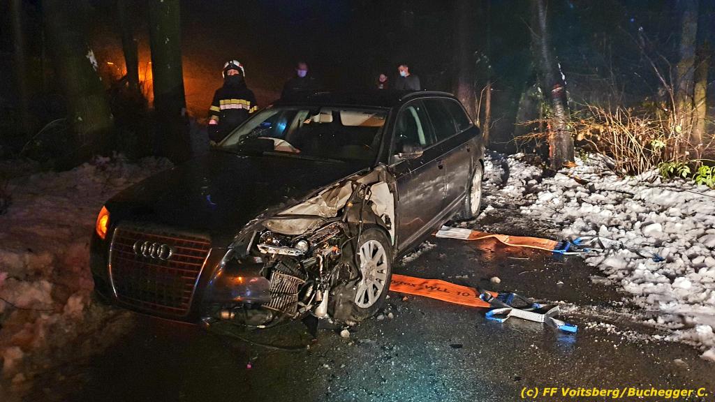 Ein PKW kam aufgrund ungeklärter Ursache links von der Fahrbahn ab und prallte gegen einen Baum. Das schwer beschädigte Fahrzeug wurde mit dem WLF-K geborgen und an einem gesicherten Ort abgestellt. Die beiden Fahrzeuginsassen blieben glücklicherweise unverletzt.