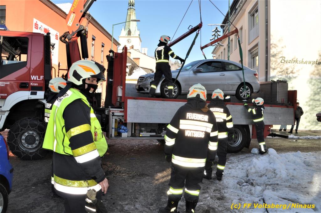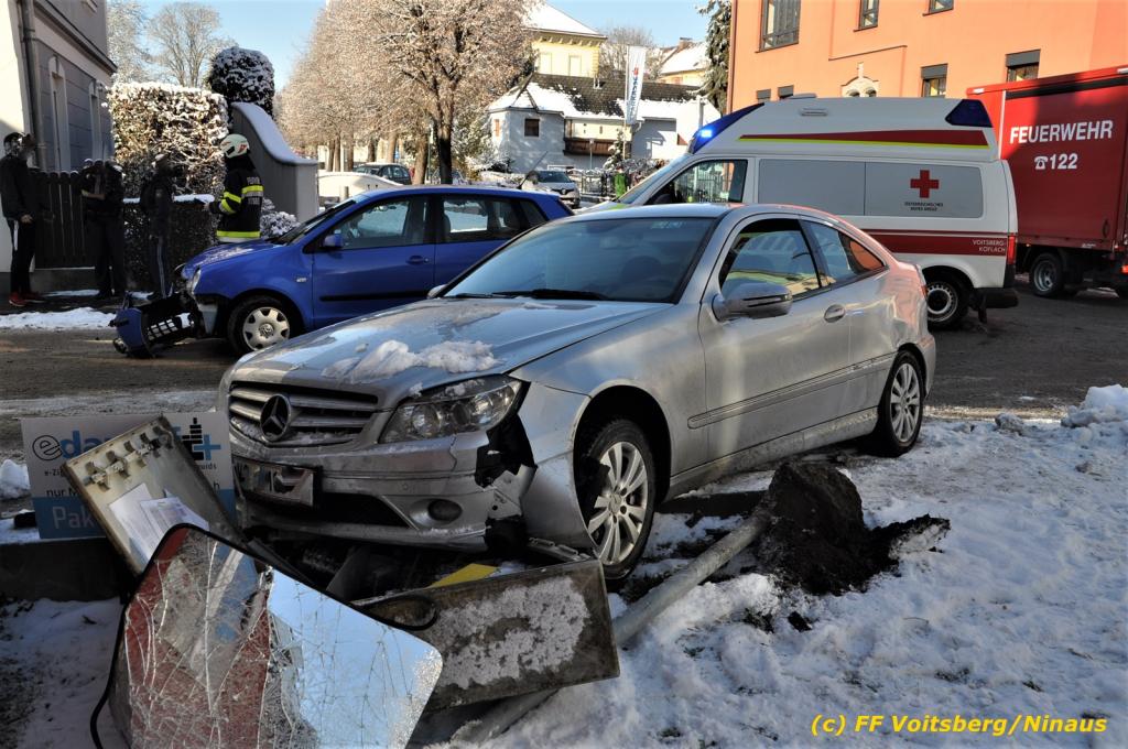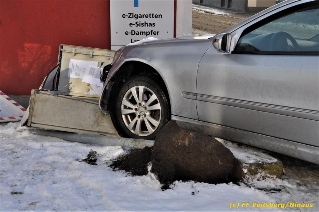 Zwei Pkw stießen an der Kreuzung zusammen, wobei ein Fahrzeug schwer beschädigt wurde und mit dem WLF-Kran von der Unfallstelle gebracht werden musste. Das leicht beschädigte zweite Fahrzeug wurde händisch auf einen Parkplatz geschoben. Schwer beschädigt wurde auch ein Strom-Verteilerkasten der Stadtwerke Voitsberg, welcher von Kräften der Stadtwerke gesichert wurde.