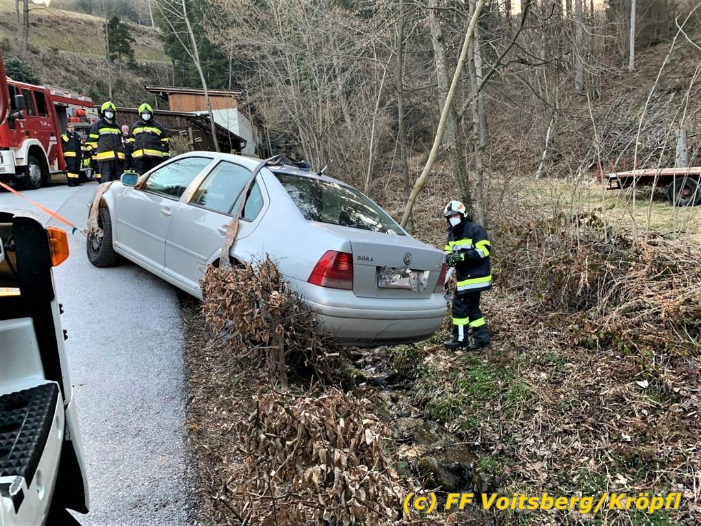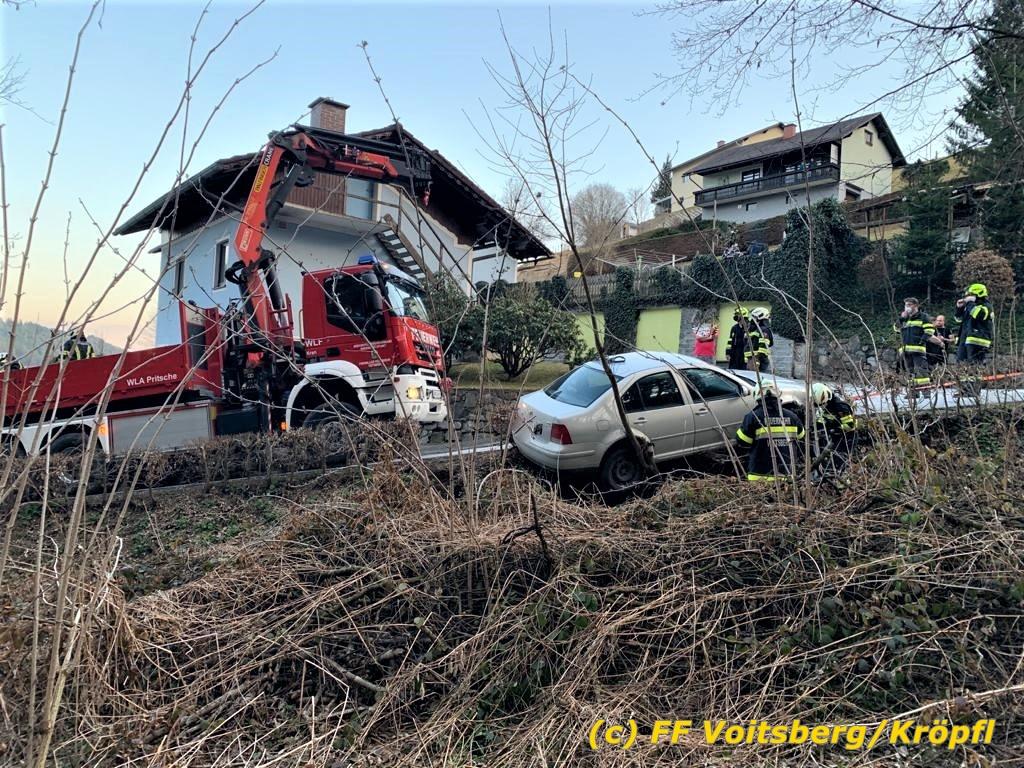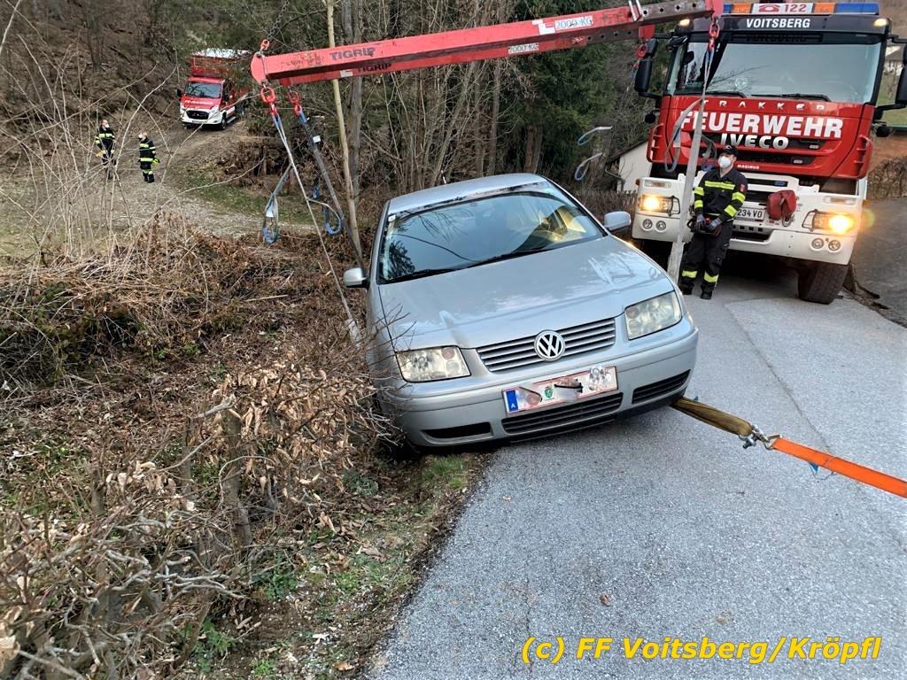 VOITSBERG, am 26.03.2021 Die FF Voitsberg wurde über Anforderung der einsatzleitenden FF Afling zu einer Fahrzeugbergung alarmiert. Ein Pkw kam von der Straße ab und drohte abzustürzen.