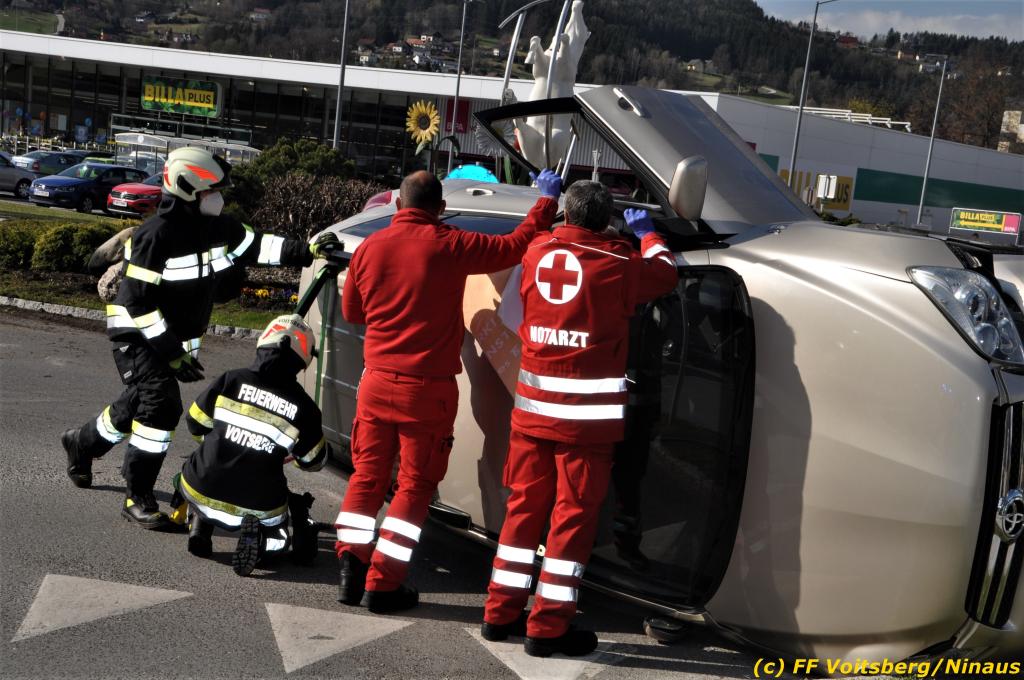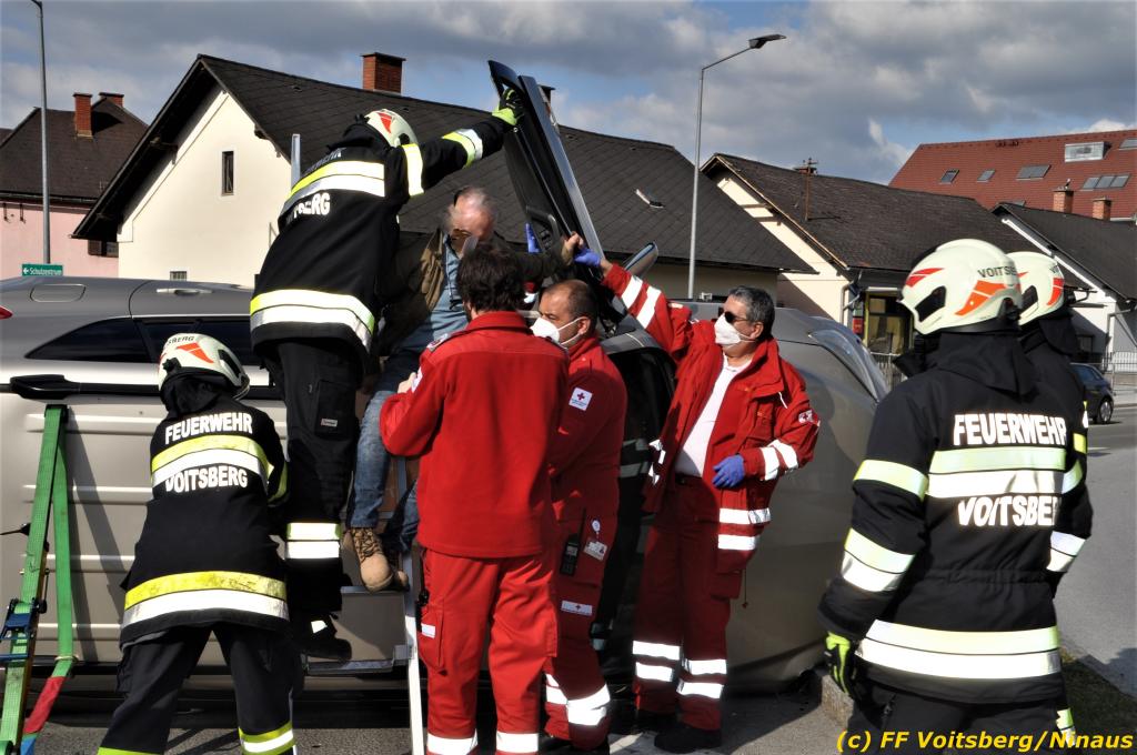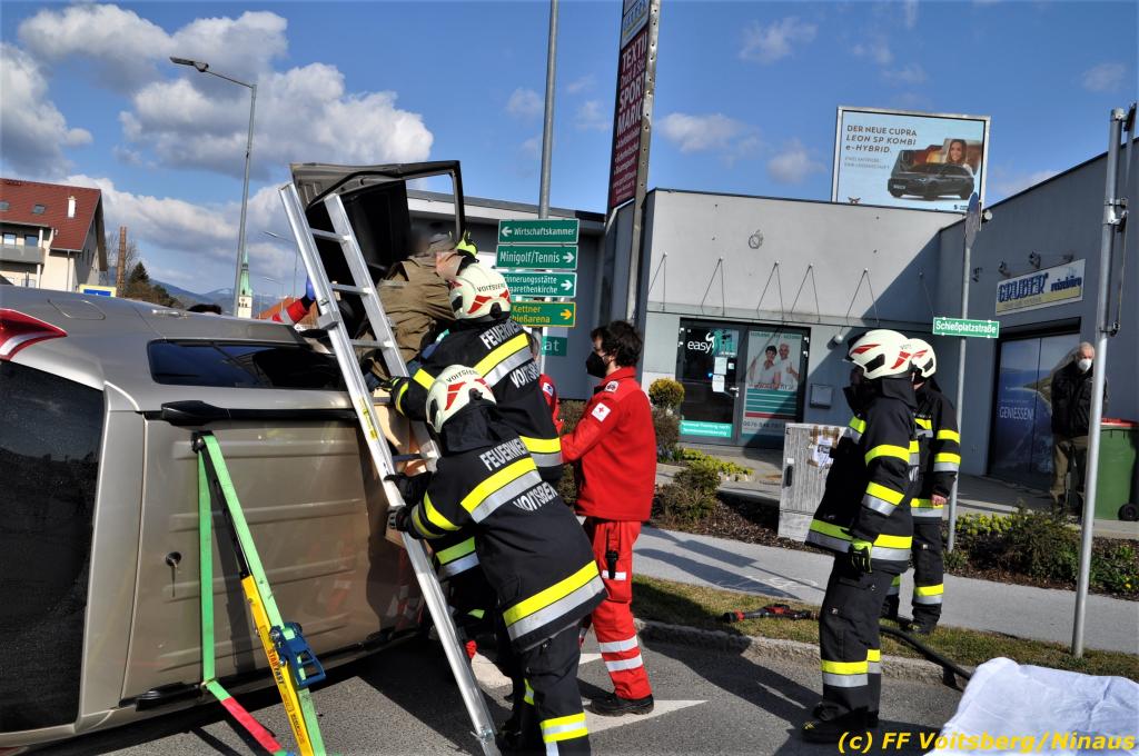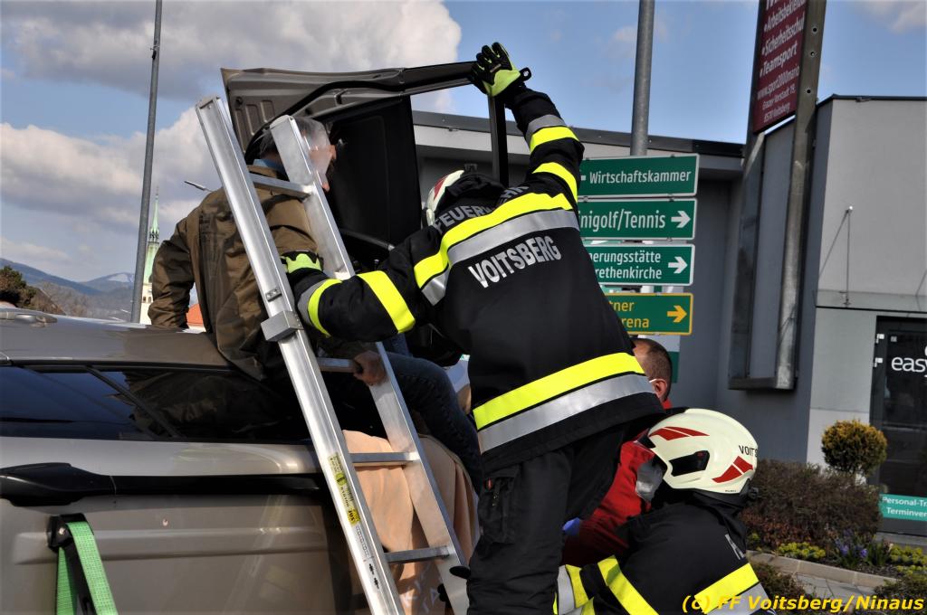 Der Lenker konnte sich aus eigener Kraft nicht befreien und wurde nach Stabilisierung des Fahrzeuges in Zusammenarbeit zwischen der FF Voitsberg und dem Roten Kreuz Voitsberg-Köflach aus seiner misslichen Situation aus dem Fahrzeug über eine Leiter mit leichten Verletzungen gerettet und in das LKH Voitsberg eingeliefert.
