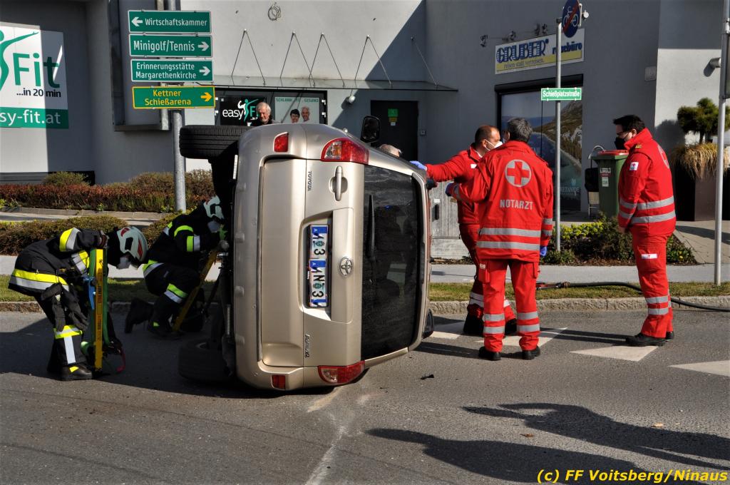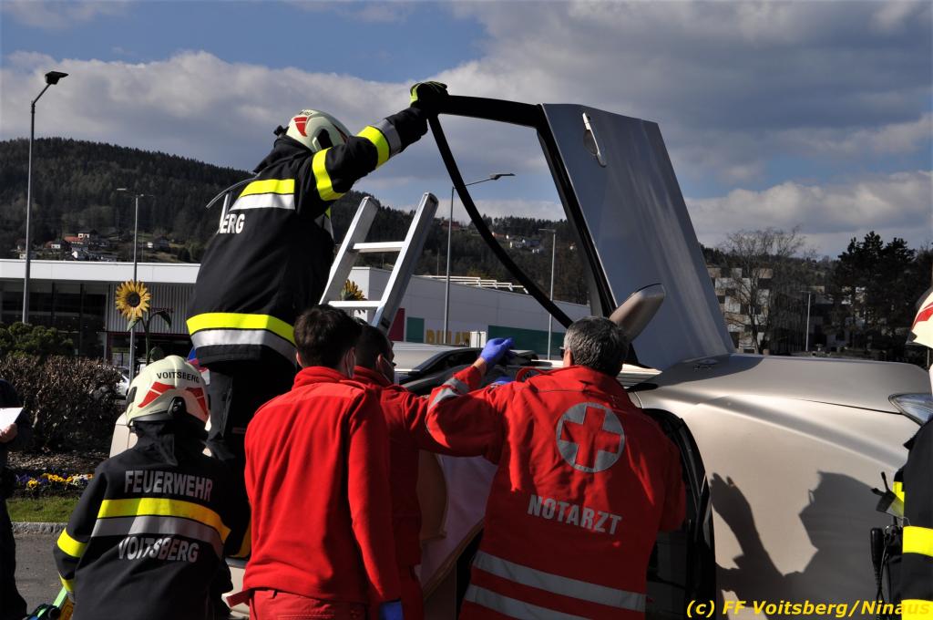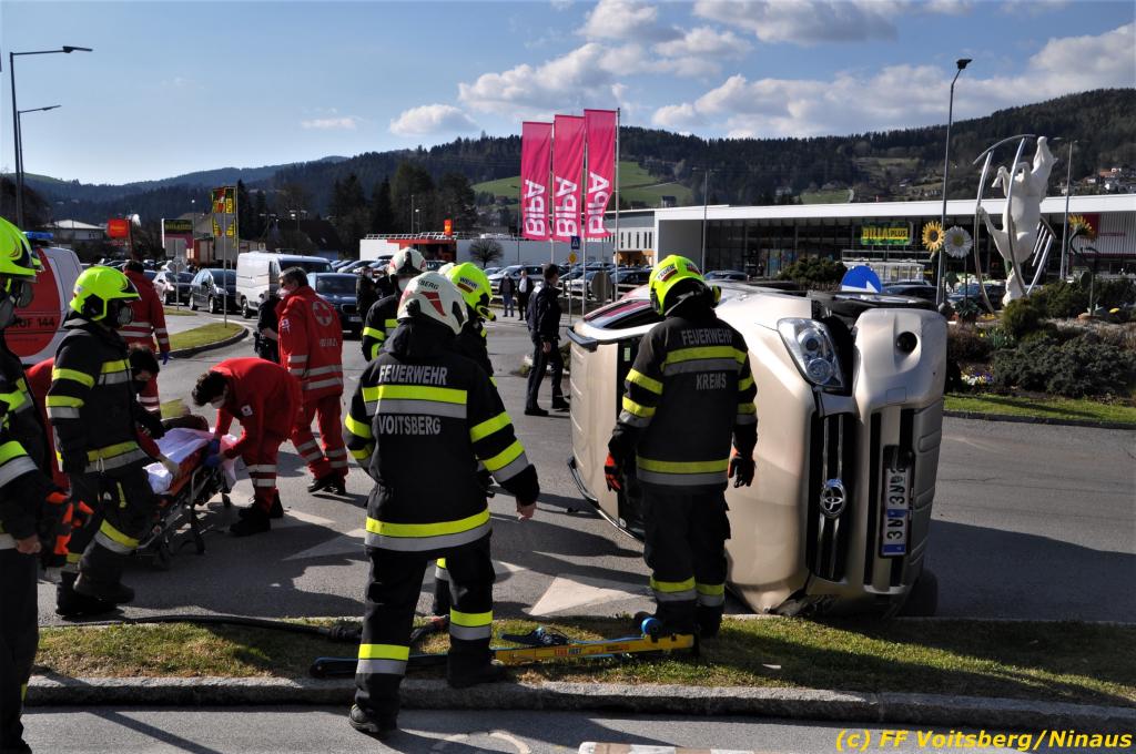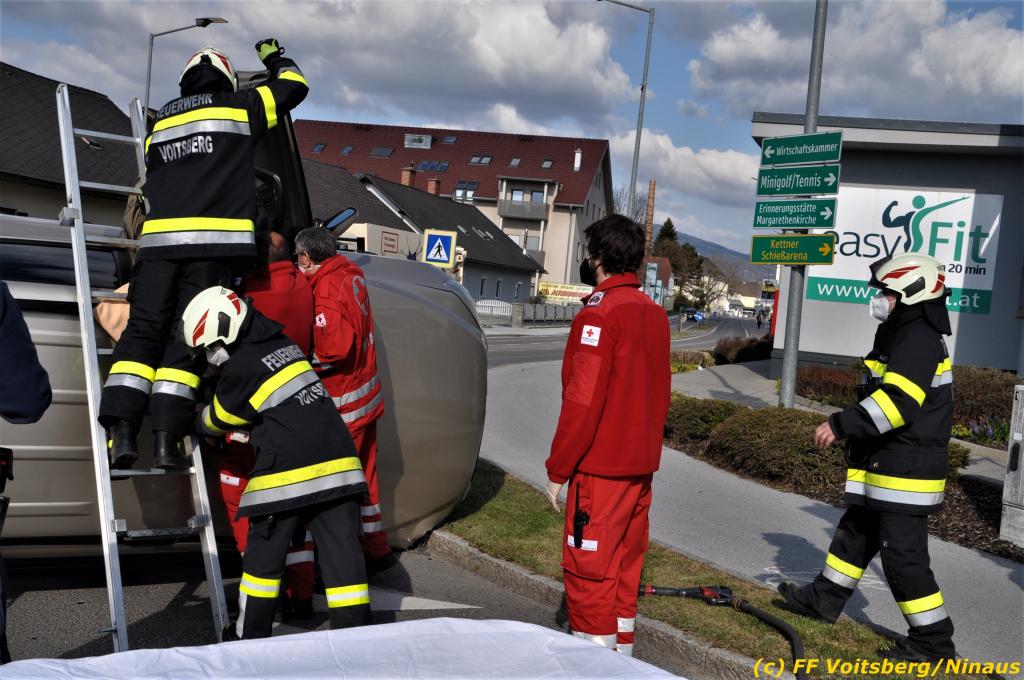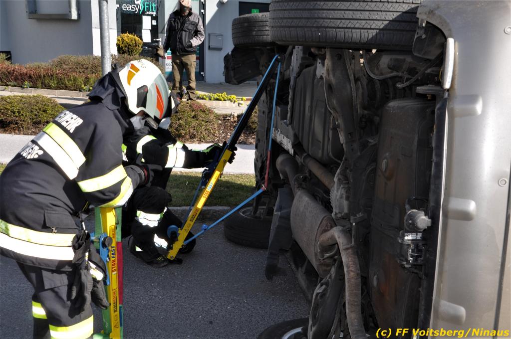 Der Lenker konnte sich aus eigener Kraft nicht befreien und wurde nach Stabilisierung des Fahrzeuges in Zusammenarbeit zwischen der FF Voitsberg und dem Roten Kreuz Voitsberg-Köflach aus seiner misslichen Situation aus dem Fahrzeug über eine Leiter mit leichten Verletzungen gerettet und in das LKH Voitsberg eingeliefert.