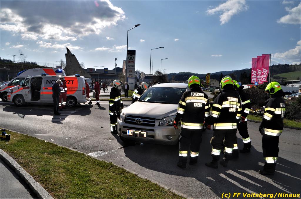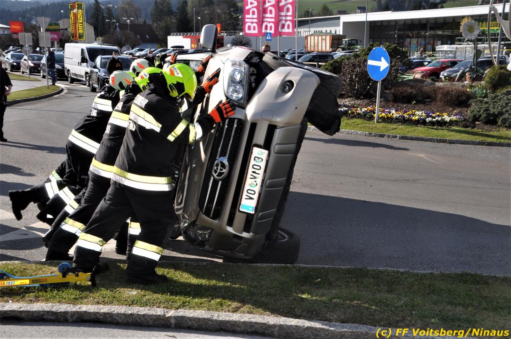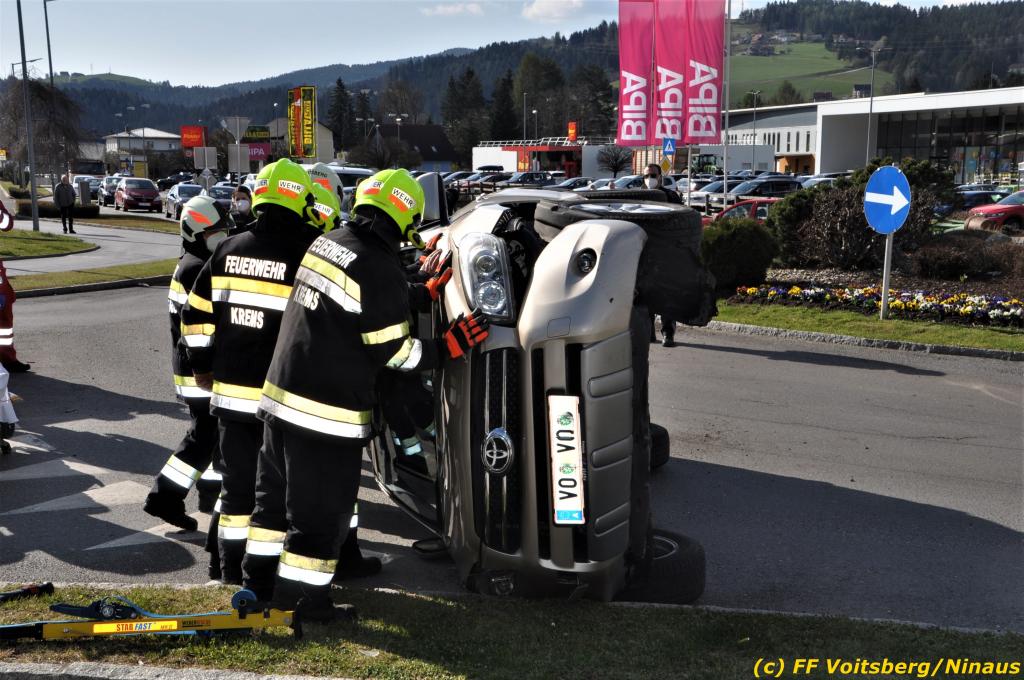 VOITSBERG, am 15.04.2021 Am Donnerstag, 15. April 2021 um ca. 9 Uhr geriet ein Pkw beim Kreisverkehr Blue Sky in Voitsberg gegen einen in der Grünanlage des Kreisverkehrs aufgestellten Stein, kippte zur Seite und blieb auf der Fahrbahn im Kreis liegen.