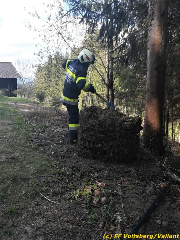 VOITSBERG, am 15.04.2021 Die FF Voitsberg wurde am Donnerstag, 15. April 2021 um 10:21 Uhr zu einem Brand eines Komposthaufens an einem Waldrand seitens der LLZ Steiermark alarmiert. Nachbarn stellten den Brand aus einer Ferne fest und alarmierten die Feuerwehr. Zu diesem Zeitpunkt war der Besitzer nicht zuhause. Bei Eintreffen stellte der Einsatzleiter fest, dass der Komposthaufen brannte und ordnete einen Angriff mit dem HD-Rohr an.