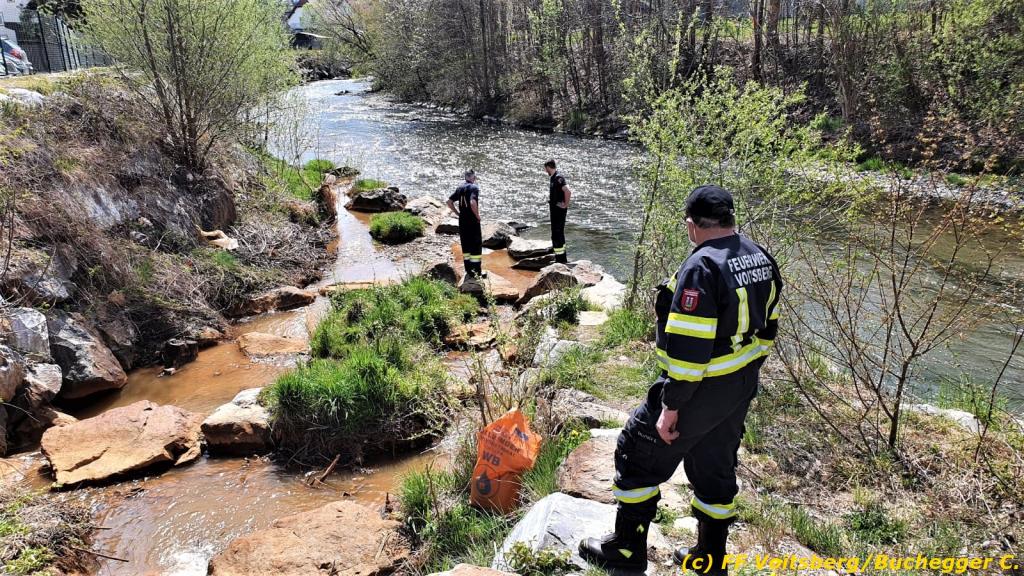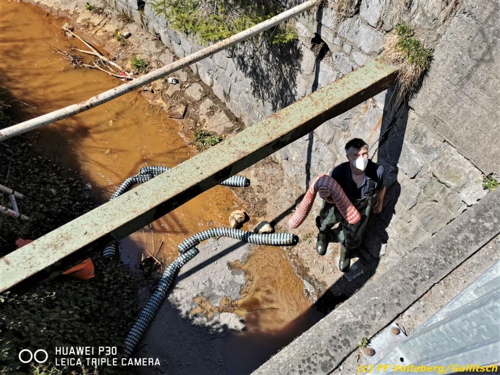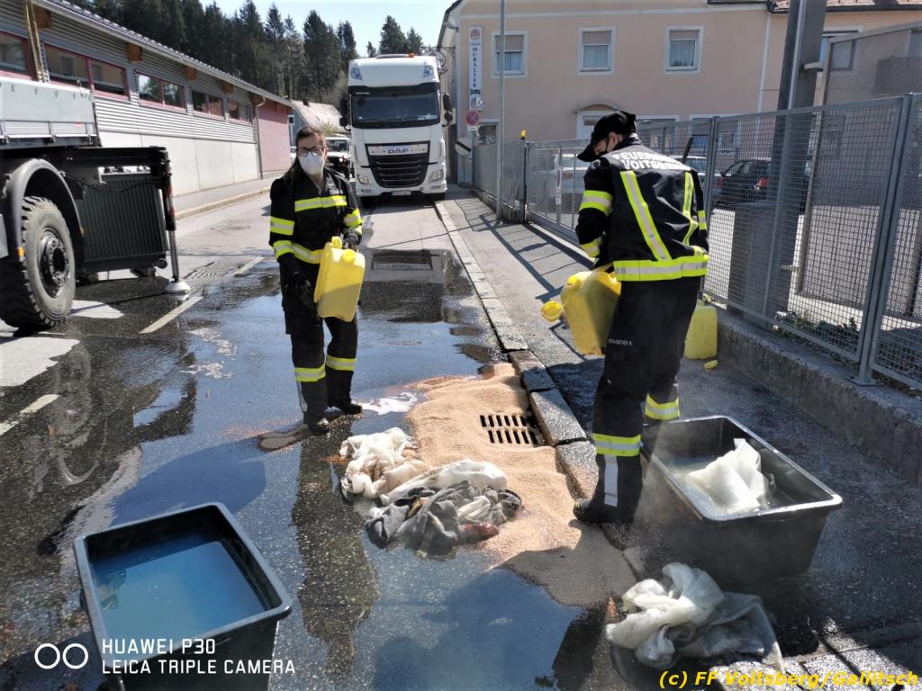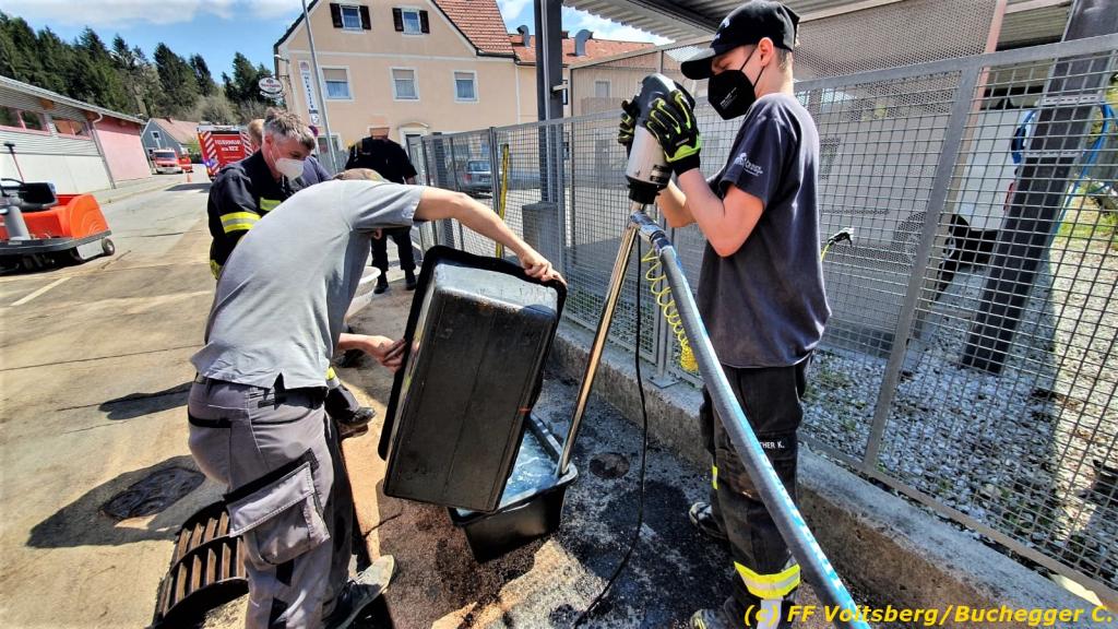 VOITSBERG, am 21.04.2021 Bei Verladearbeiten eines Trafos gelangten nach einem technischen Gebrechen in den Vormittagsstunden des 21. April 2021 in der Burggasse in Voitsberg ca. 250 l Hydrauliköl über einen Abfluss in den Tregistbach.