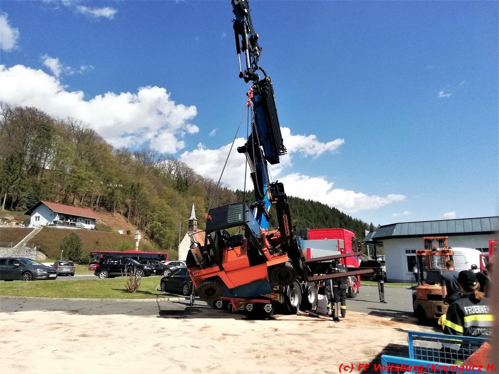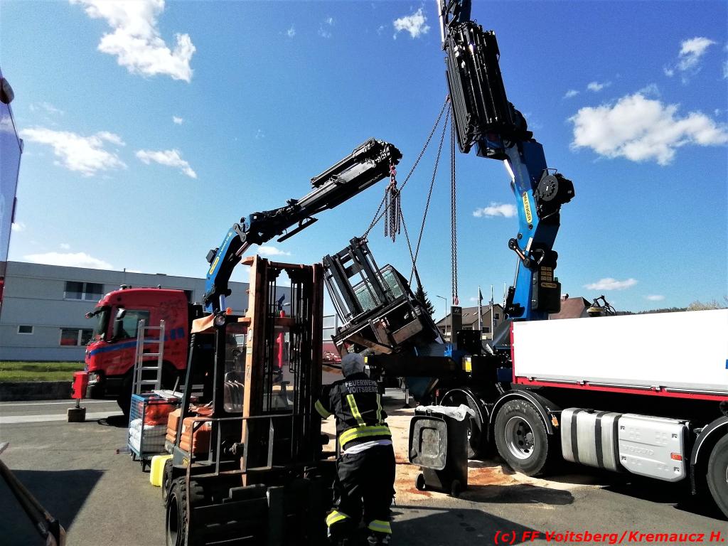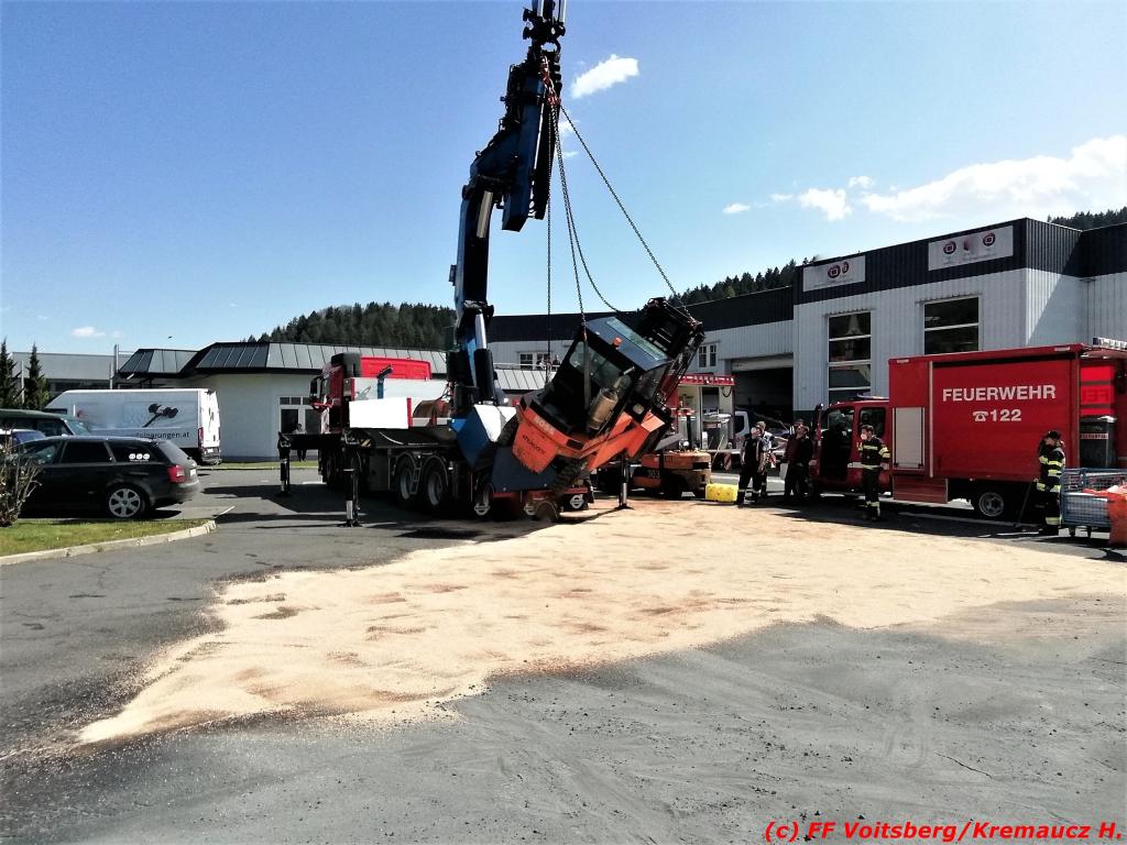 VOITSBERG, am 23.04.2021 Nachdem an einem Lkw-Kran nach einem technischen Gebrechen bei Verladearbeiten Hydrauliköl austrat, wurde die FF Voitsberg am Freitag, 23. April 2021 um 14:28 Uhr zu einem Schadstoffeinsatz in die Grazer Vorstadt in Voitsberg alarmiert.