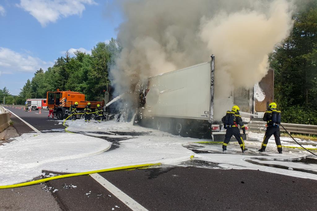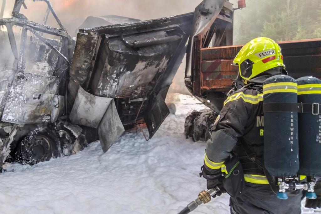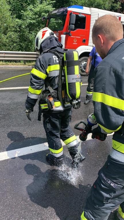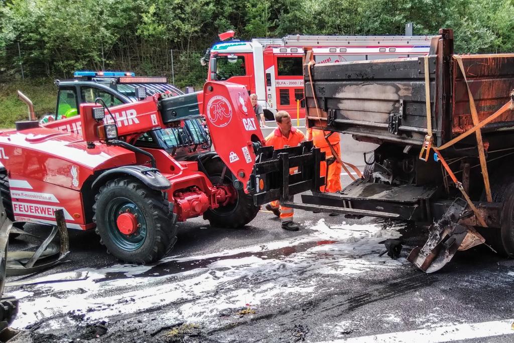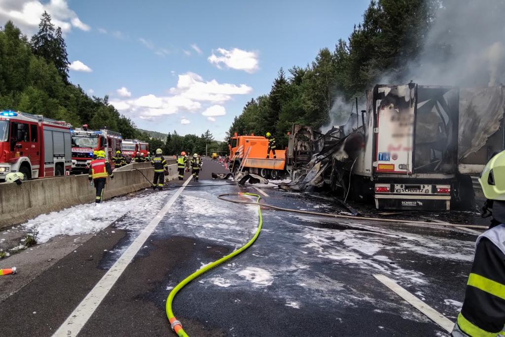 Aus bisher noch ungeklärter Ursachen fuhr ein Lenker eines Sattelschleppers auf einen LKW der Asfinag auf, die gerade in einem abgesicherten Bereich mit Mäharbeiten beschäftigt waren. Nachkommende Zivilpersonen versuchten mit Feuerwehrlöschern den Brand zu löschen und befreiten den Lenker des Sattelschleppers aus seinem Fahrzeug. Beim Eintreffen der Einsatzkräfte stand der Sattelschlepper bereits im Vollbrand.