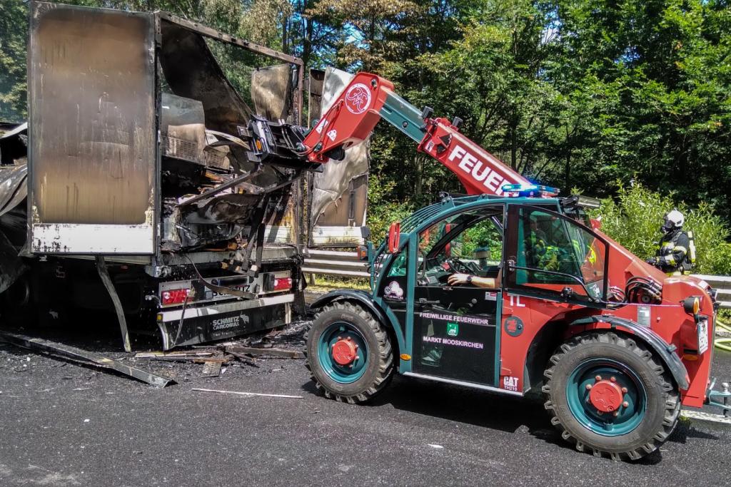 Mit dem Teleskoplader der Feuerwehr Mooskirchen wurde gemeinsam mit der Asfinag die Ladung des Sattelschleppers entladen um auch die übrigen Glutnester vollständig löschen zu können.