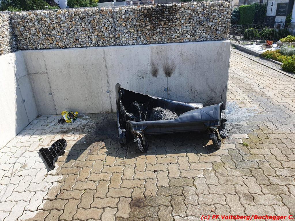 VOITSBERG, am 21.08.2021 Im Areal des Friedhofes Voitsberg geriet aus unbekannten Gründen ein Müllcontainer in Brand und brannte total aus. Die FF Voitsberg führte Nachlöscharbeiten durch.