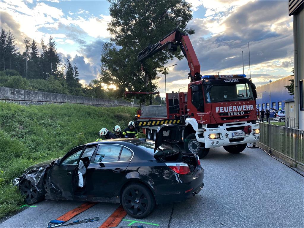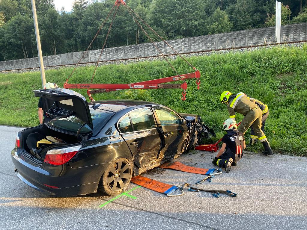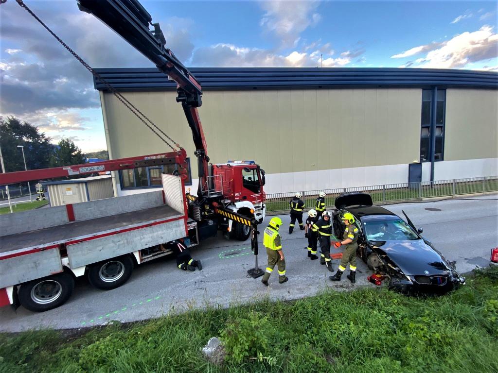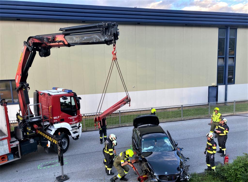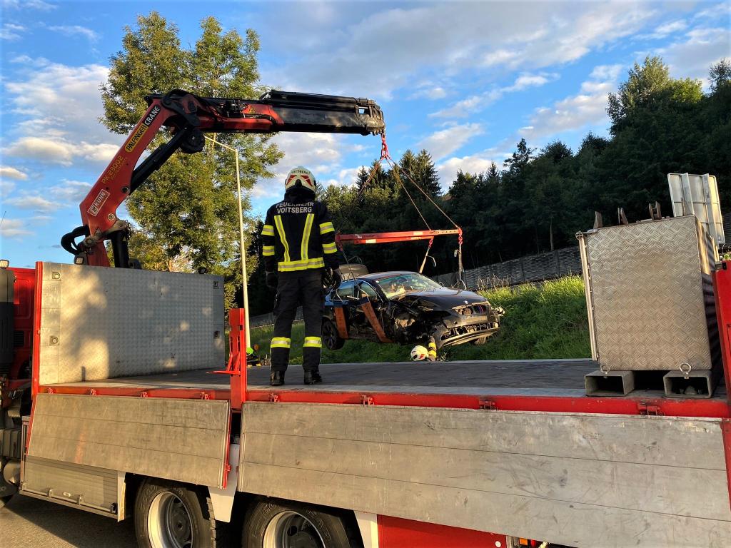 VOITSBERG, am 27.08.2021 Nach einem Zusammenstoß zweier Pkw wurde einer nach Anforderung der einsatzleitenden FF Krems mittels WLF-Kran geborgen und an einem gesicherten Platz abgestellt.