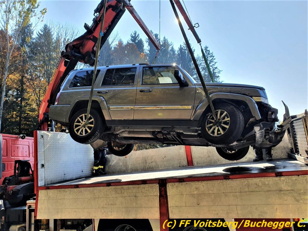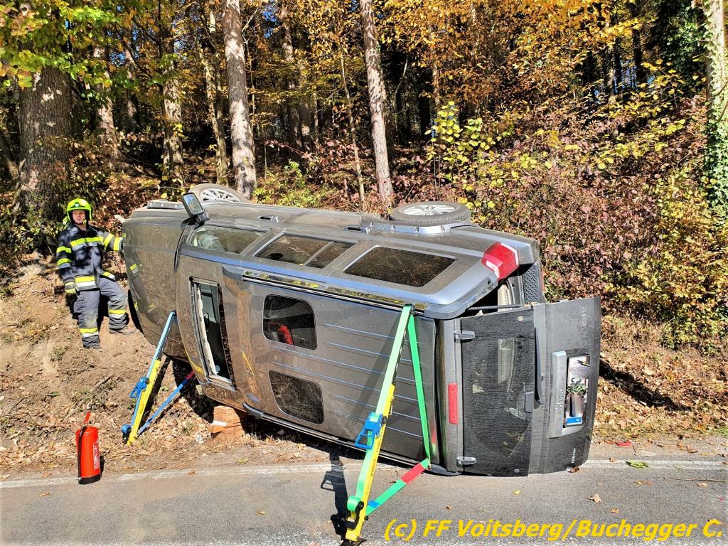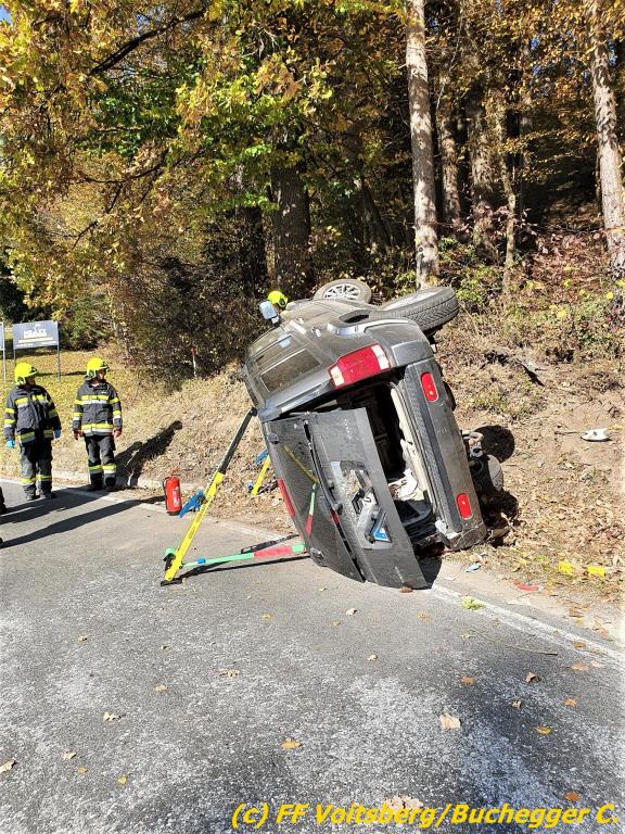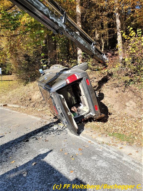 VOITSBERG, am 30.10.2021 Ein Pkw kam von der Landesstrasse ab, geriet auf eine Böschung und kippte seitlich um. Die einsatzleitende Feuerwehr Krems verständigte das WLF-Kran der FF Voitsberg.