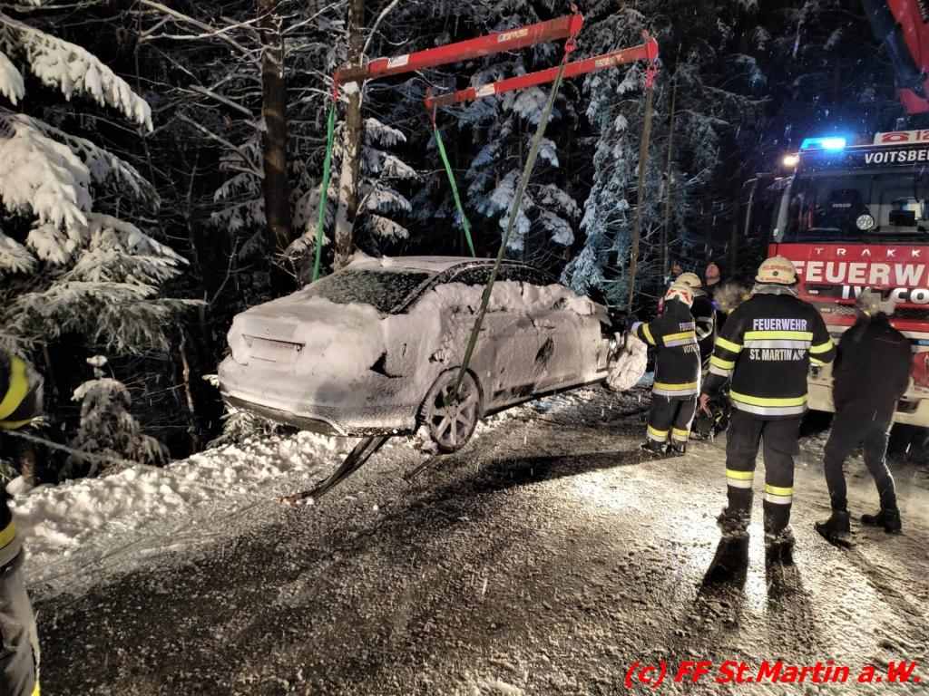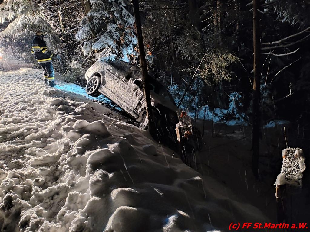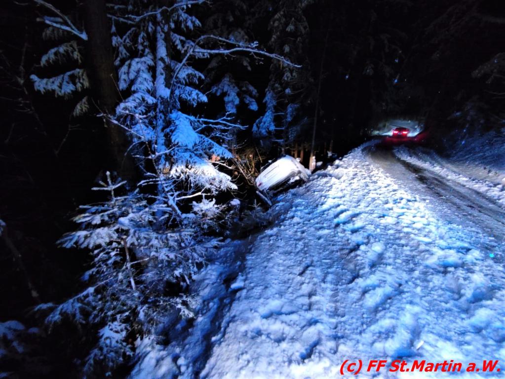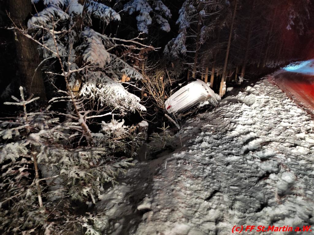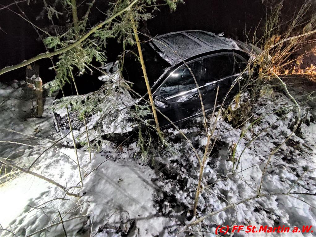 VOITSBERG, am 09.12.2021 Im Ortsteil Kleinwöllmiß der Gemeinde St. Martin a. W. kam am Donnerstag, 9. Dezember 2021 kurz nach 5 Uhr ein Pkw von der Straße ab, stürzte über eine Böschung und blieb an einem Baum hängen.