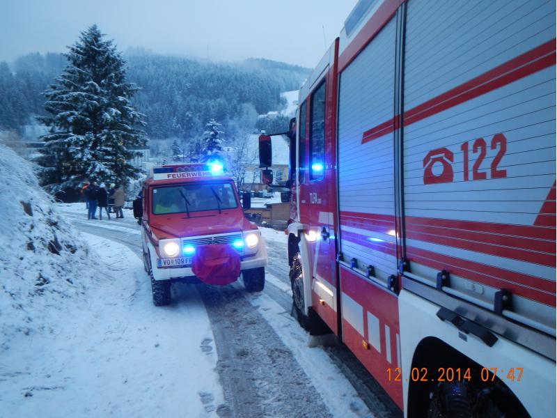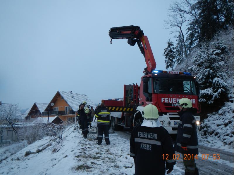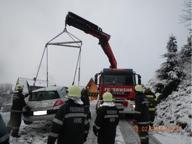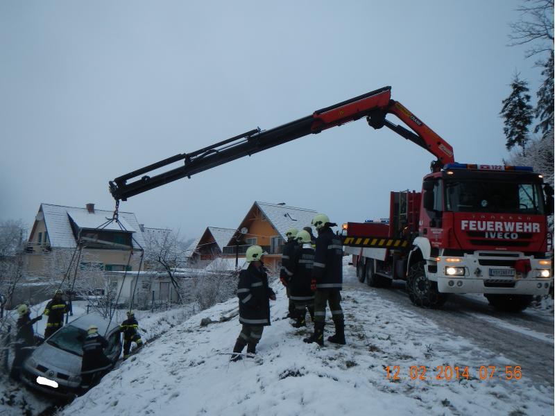 VOITSBERG, am 12.02.2014 Auf schneeglatter Fahrbahn kam ein PKW von der Straße ab und rutschte über eine Böschung. Über Anforderung der FF Krems wurde das Fahrzeug mit dem WLF-Kran unter Zusammenarbeit beider Wehren geborgen.