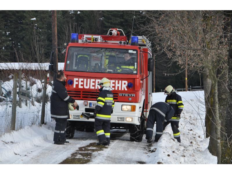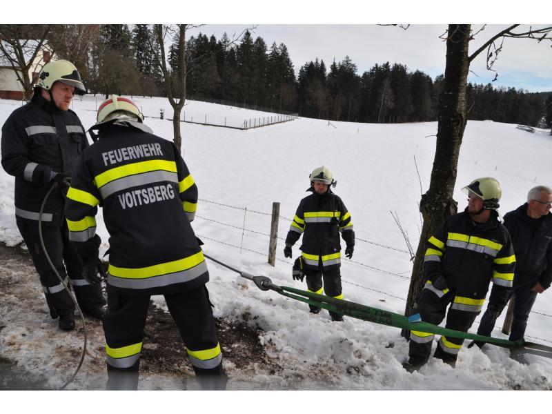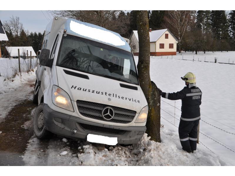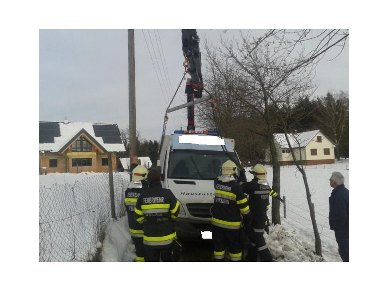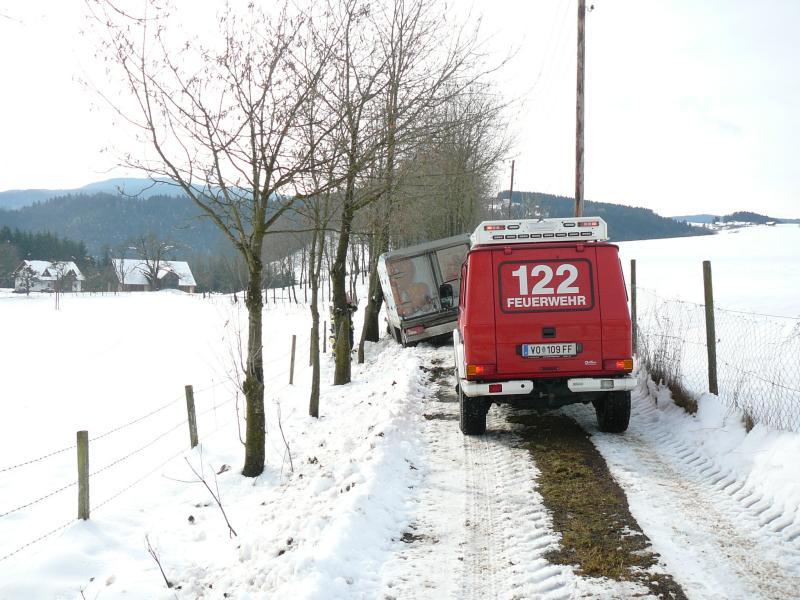 VOITSBERG, am 07.02.2014 Beim Zurückfahren auf einem Privatweg rutschte ein Klein-LKW eines Zustellservice von der Straße in einen Graben und drohte umzustürzen. Das Fahrzeug wurde mit dem WLF-Kran geborgen und setzte die Fahrt auf eigener Achse fort.