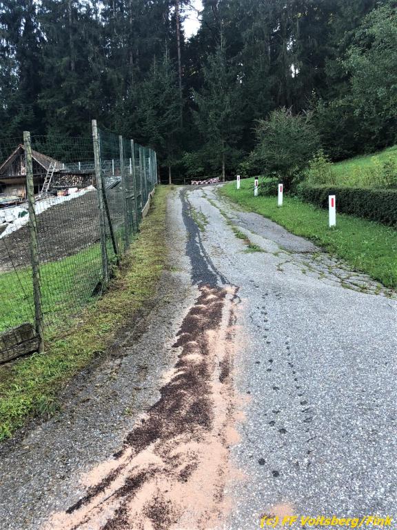 VOITSBERG, am 30.08.2022 Ölverlust bei Minibagger nach techn.Gebrechen - 30m lange Ölspur auf Strasse mit Bindemittel gebunden und fachgerecht entsorgt - Fahrzeug mittels WLF auf einem gesicherten Platz abgestellt
