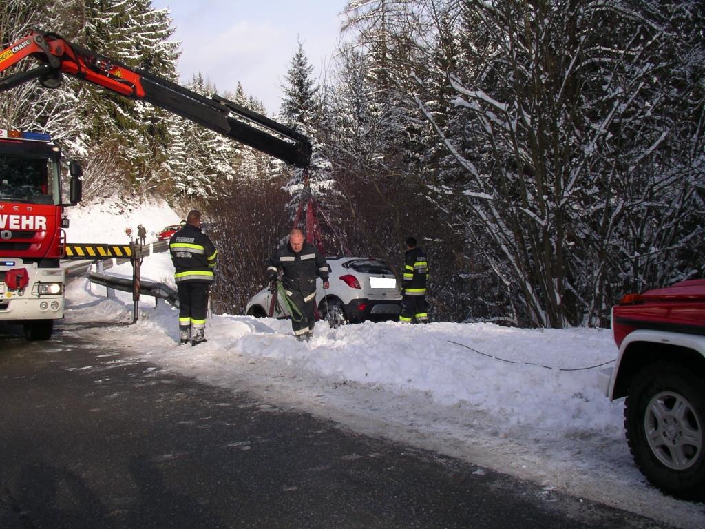 VOITSBERG, am 29.12.2014 Ein PKW geriet aus ungeklärter Ursache von der LB 70 ab und schlitterte über eine Böschung. Das Fahrzeug wurde mittels Seilwinde des KRFB und mit dem WLF-Kran geborgen. Die FF Edelschrott baute einen Brandschutz auf, sicherte die Unfallstelle ab und führte die Verkehrsregelung durch.