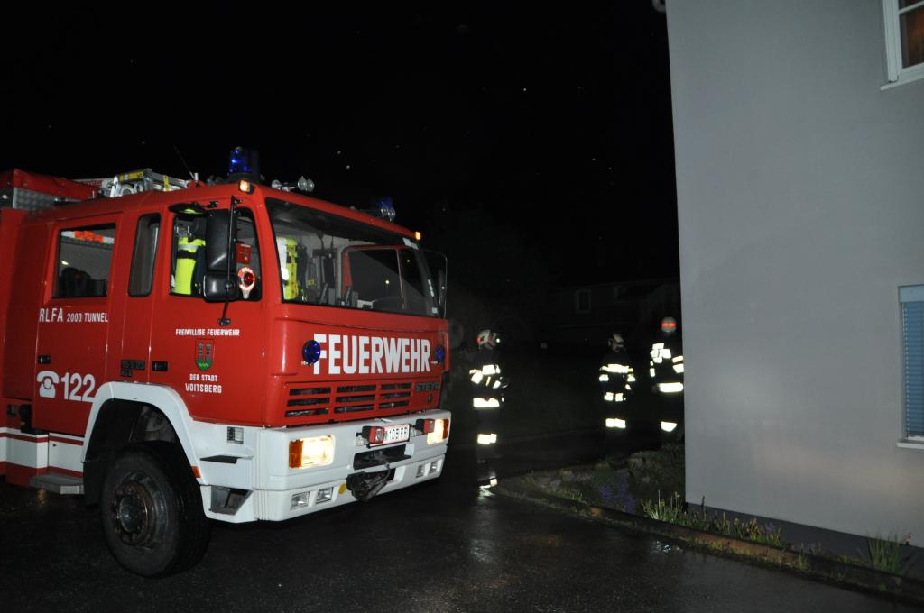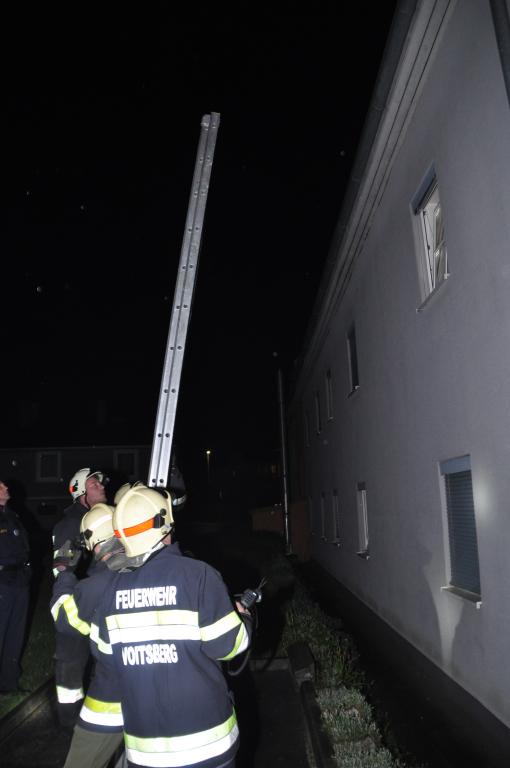 VOITSBERG, am 02.05.2015 Aufmerksame Nachbarn hörten aus einer Wohnung ein auffälliges Wimmergeräusch einer Person. Daraufhin wurde die Polizei verständigt, die wiederum die FF Voitsberg über die LLZ zwecks Öffnung der Wohnung anforderte. Nach Erkundung durch den Einsatzleiter wurde mittels Schiebeleiter nach der Öffnung eines gekippten Fensters in die Wohnung im 1.Stock eingestiegen und die Wohnungstüre zwecks Versorgung und Abtransport der Person durch das Rote Kreuz Voitsberg geöffnet. Die Erhebungen wurden von der Polizei durchgeführt.