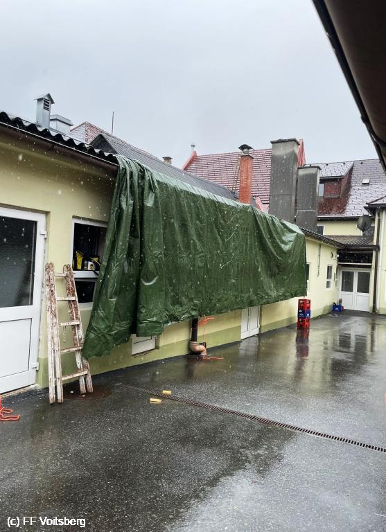 Die FF Voitsberg sicherte in Zusammenarbeit mit privaten Personen die Einsatzstelle am Voitsberger Hauptplatz und machte das Dach provisorisch mit Planen aufgrund starken Regens dicht.