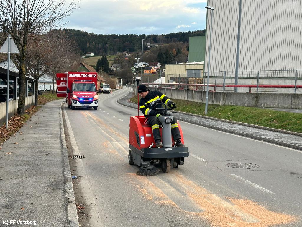 Ca. 150m lange Ölspur mit Bindemittel gebunden, mit feuerwehreigenen Kehrmaschine aufgesaugt und fachgerecht entsorgt.