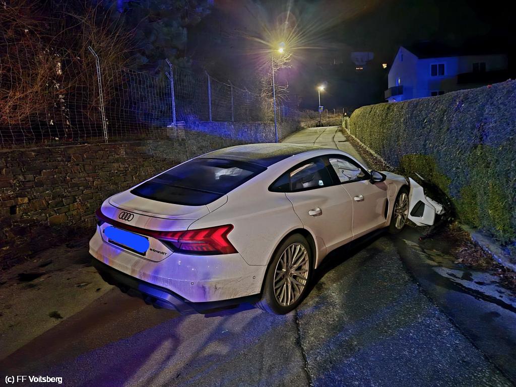 VOITSBERG, am 30.01.2025 Nach einem Aufprall eines PKW an einer Betonwand war das Fahrzeug schwer beschädigt und musste von der Gemeindestraße entfernt werden. Verletzt wurde niemand. Binden ausgeronnener Betriebsmittel und Entsorgung.
