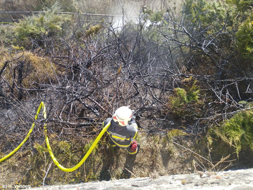 Der Brand im unwegsamen Gelände konnte mit zwei Löschleitungen rasch unter Kontrolle gebracht werden.