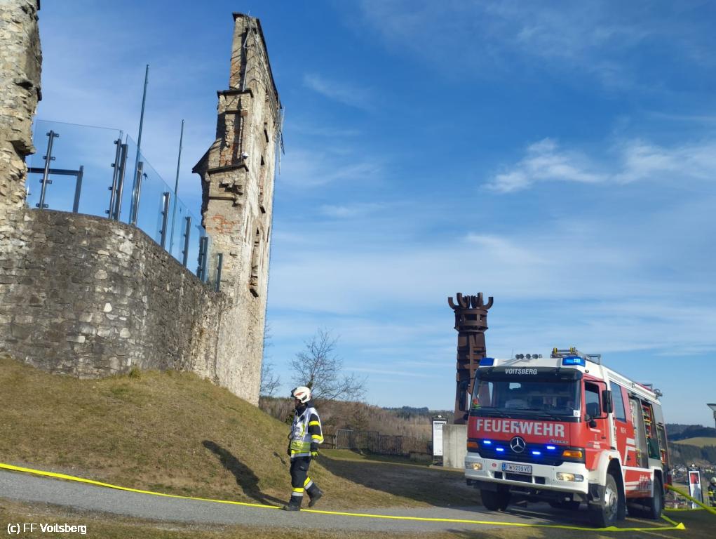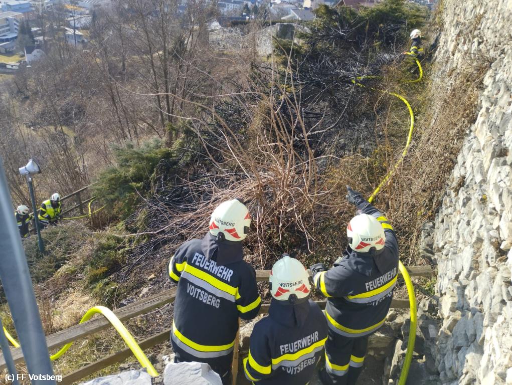 Im Bereich der Burgruine Obervoitsberg gerieten aus ungeklärter Ursache mehrere Büsche in Brand. Die Rauchsäule war schon von weitem sichtbar.