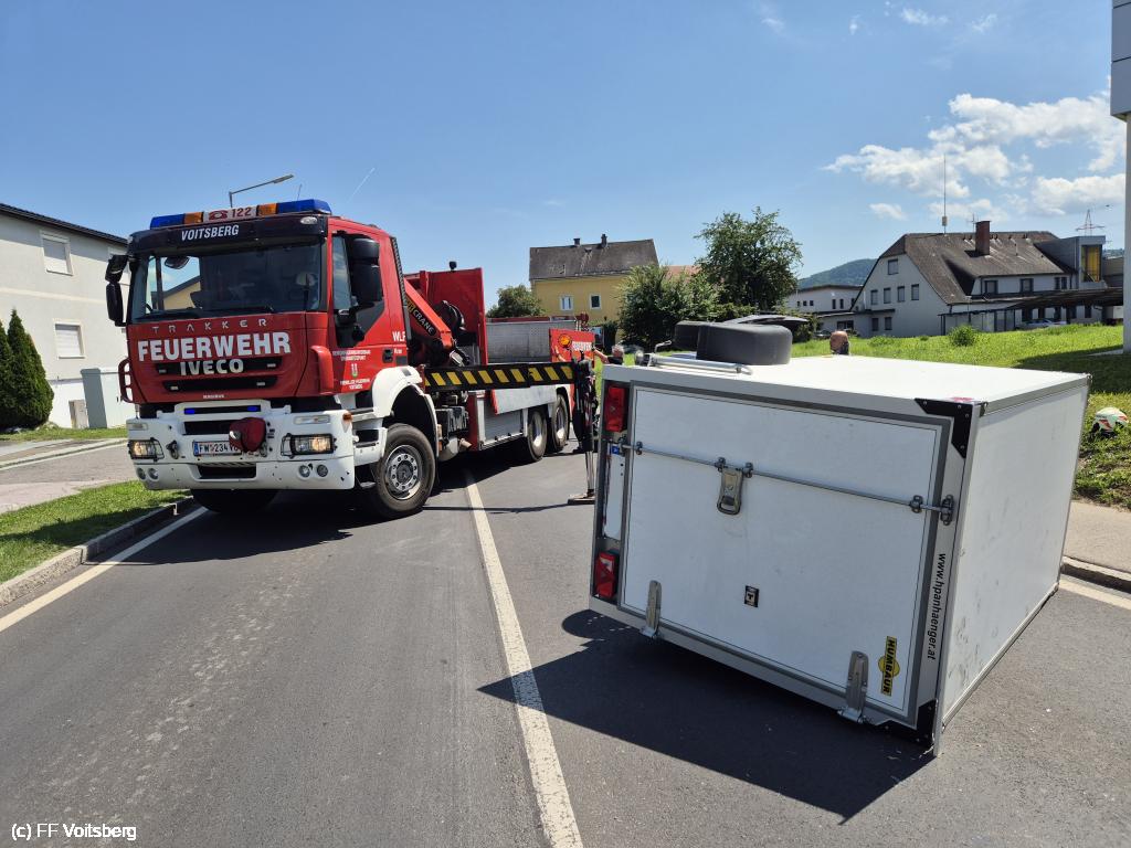 Ein PKW mit Anhänger geriet bei der Ausfahrt aus einem Kreisverkehr ins Schleudern. Dadurch kippte der Anhänger um und blieb auf der Fahrbahn liegen.