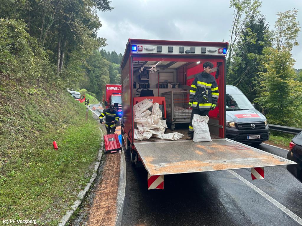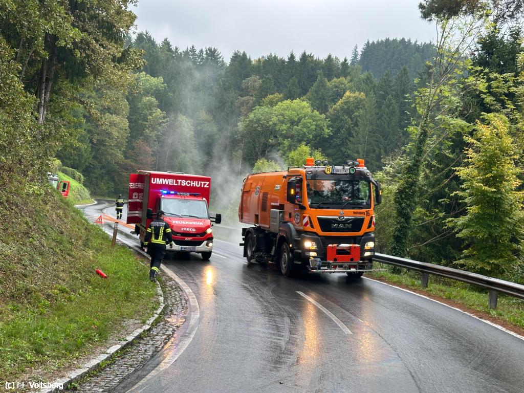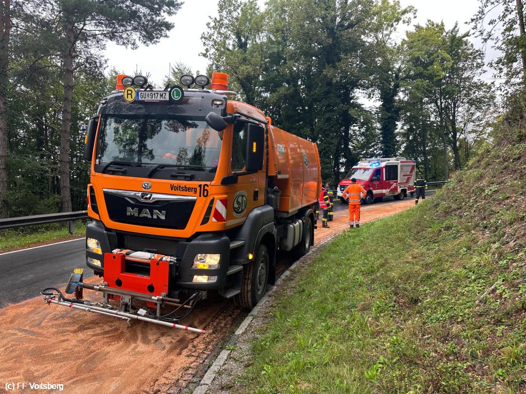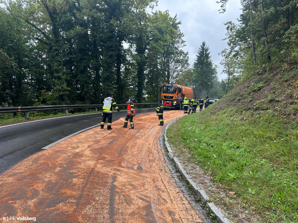 VOITSBERG, am 30.09.2025 Eine rund 500 m lange Ölspur auf der L317 wurde gemeinsam mit der FF Krems und der Straßenmeisterei Voitsberg gebunden und die Fahrbahn anschließend gereinigt.