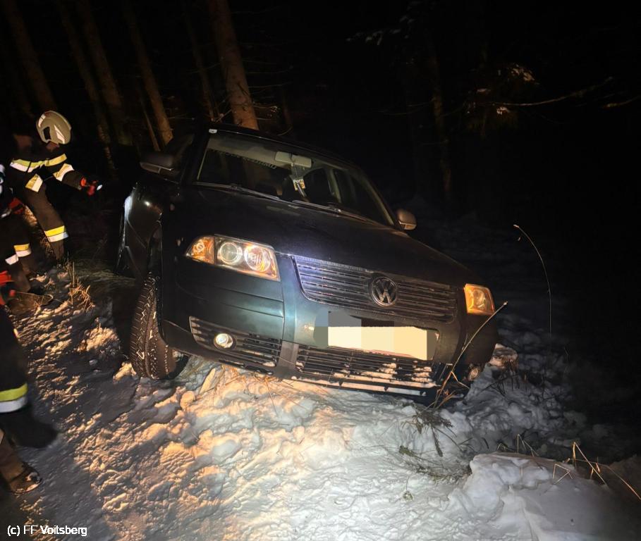 Ein PKW Lenker rutschte bei winterlichen Fahrverhältnissen in den Straßengraben und musste geborgen werden.
