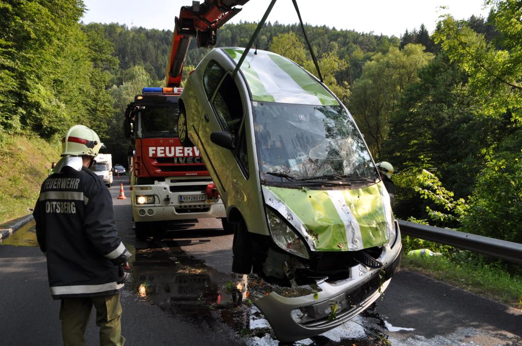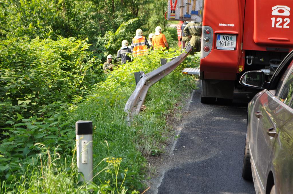 VOITSBERG, am 13.07.2013 Aus ungeklärter Ursache geriet ein PKW auf der B 70 in den Kremser Reihen ins Schleudern, geriet auf das Bankett, schlitterte entlang der Leitschiene und stürzte sich überschlagend in die Kainach, welche zum Glück Niederwasser führte, und landete dort am Dach liegend. Die unbestimmten Grades verletzte Fahrzeuglenkerin wurde in Zusammenarbeit der Feuerwehren Gaisfeld, Krems und Voitsberg sowie des Roten Kreuzes Voitsberg geborgen und von der Rettung ins LKH Voitsberg eingeliefert. Die darauffolgende Bergung und den drauffolgenden Abtransport führte die FF Voitsberg mit dem WLF durch. Die Verkehrsregelung und Vermessung wurde durch die Polizeiinspektion Voitsberg durchgeführt.
