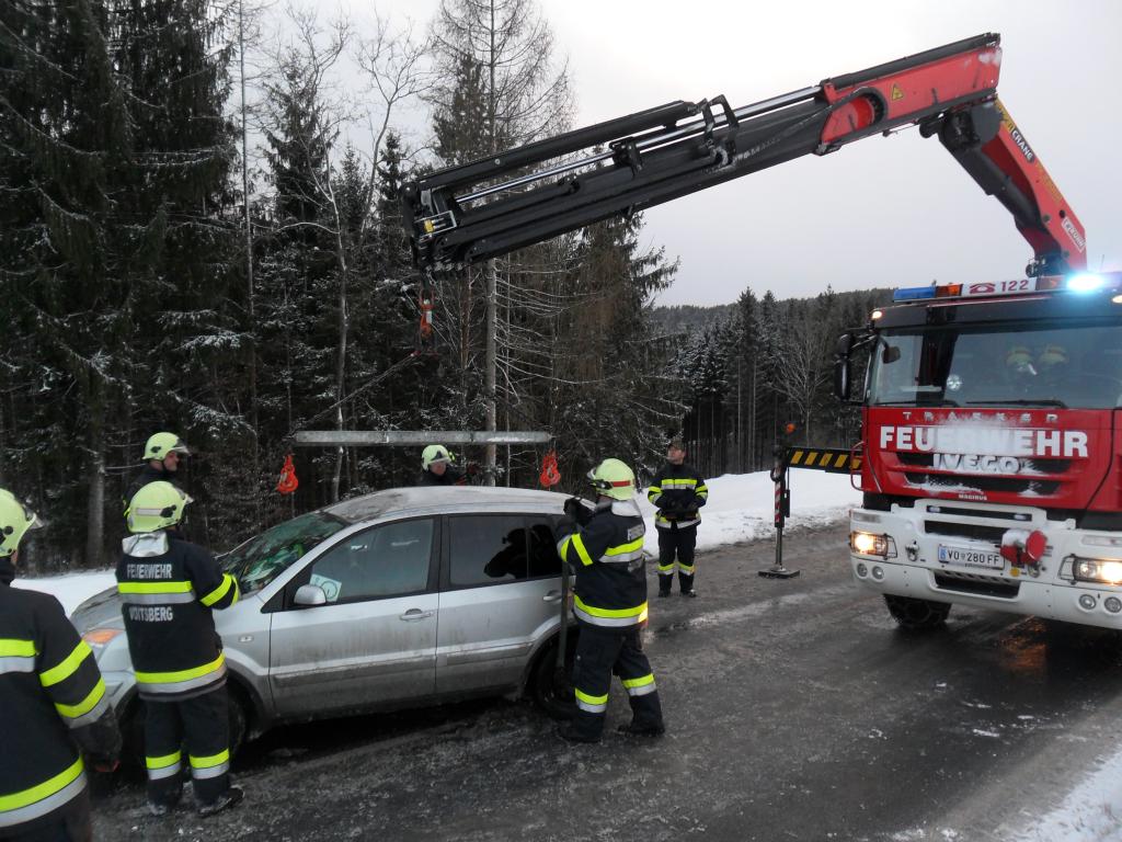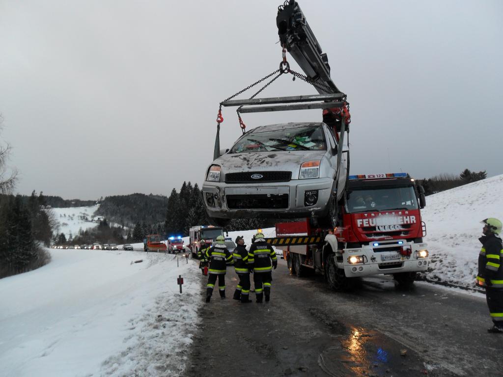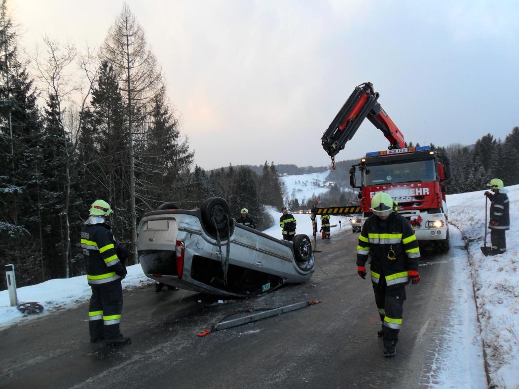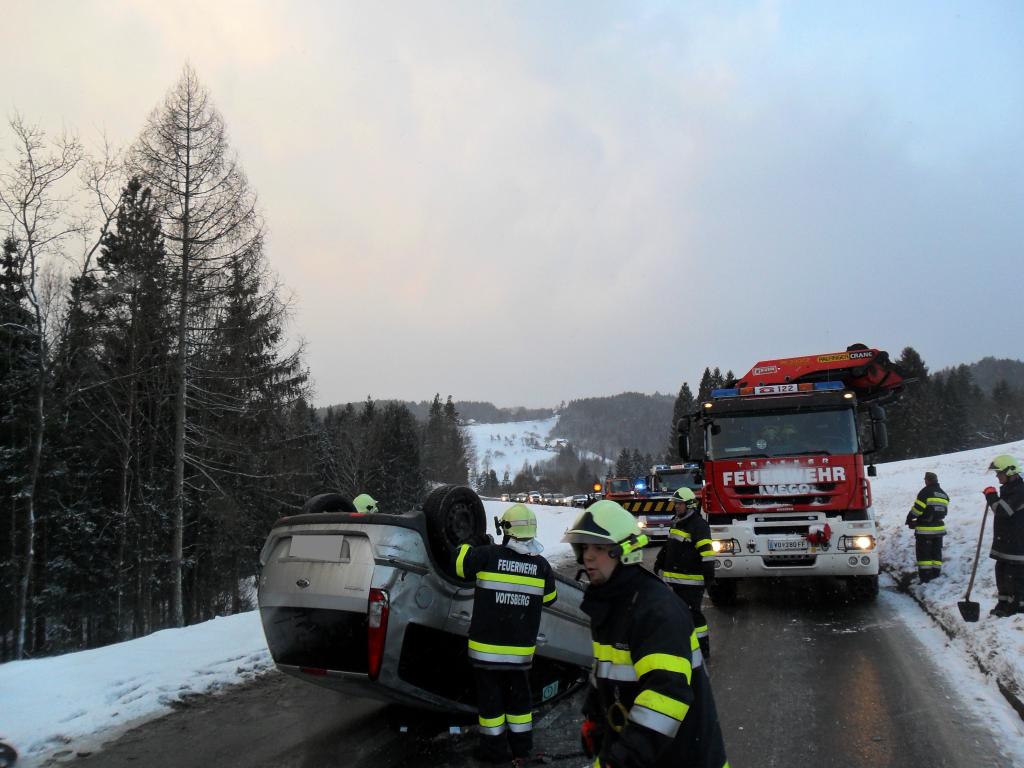VOITSBERG, am 08.02.2015 Aus ungeklärter Ursache geriet ein PKW auf eine Böschung, stürzte sich überschlagend auf die Landesstraße und kam am Dach zu liegen. Nach Anforderung durch die FF Krems wurde das WLF-Kran Voitsberg zwecks Bergung alarmiert und das beschädigte Fahrzeug von der Unfallstelle entfernt.