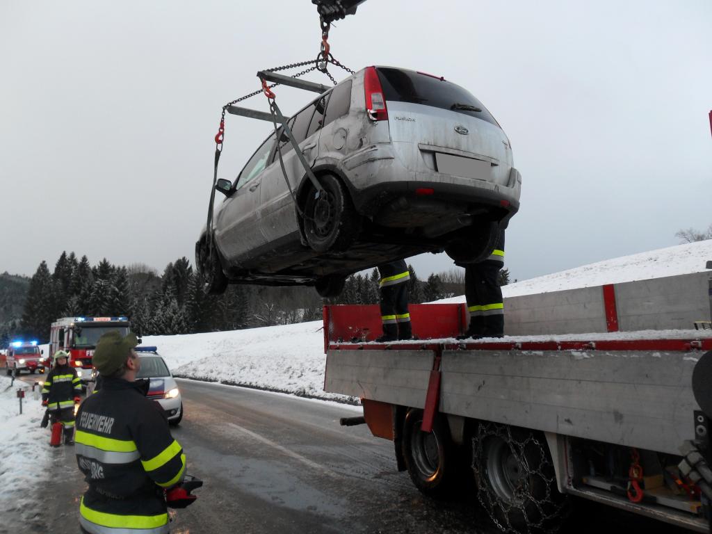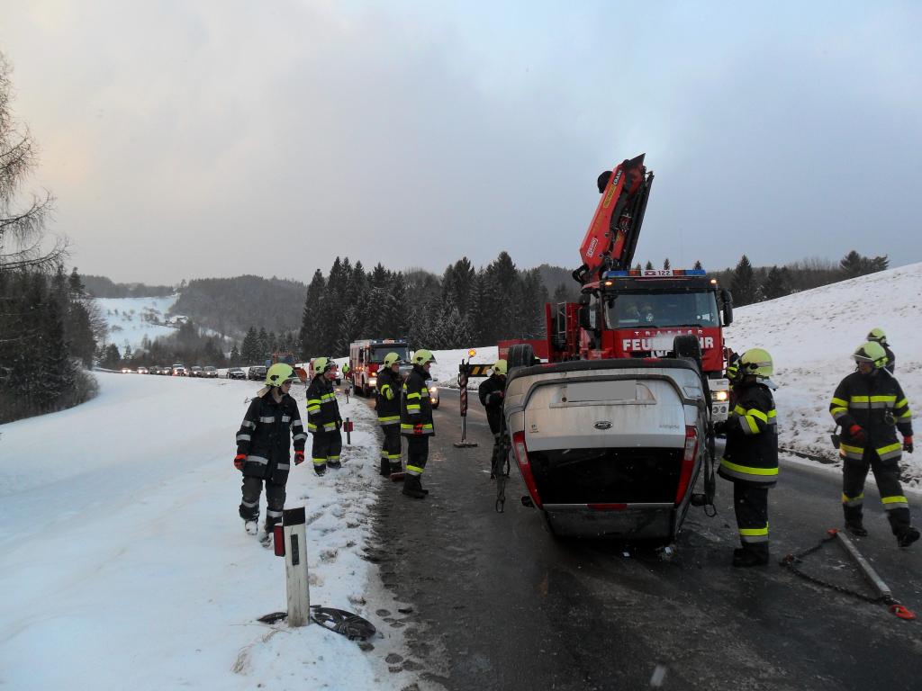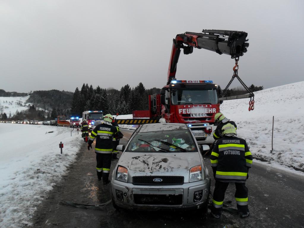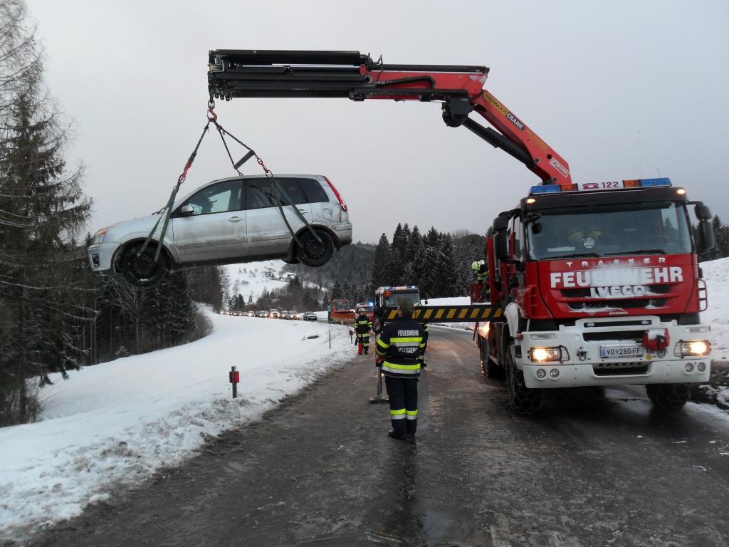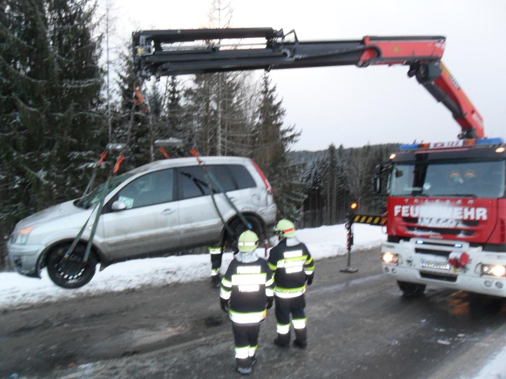 VOITSBERG, am 08.02.2015 Aus ungeklärter Ursache geriet ein PKW auf eine Böschung, stürzte sich überschlagend auf die Landesstraße und kam am Dach zu liegen. Nach Anforderung durch die FF Krems wurde das WLF-Kran Voitsberg zwecks Bergung alarmiert und das beschädigte Fahrzeug von der Unfallstelle entfernt.