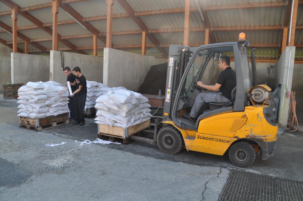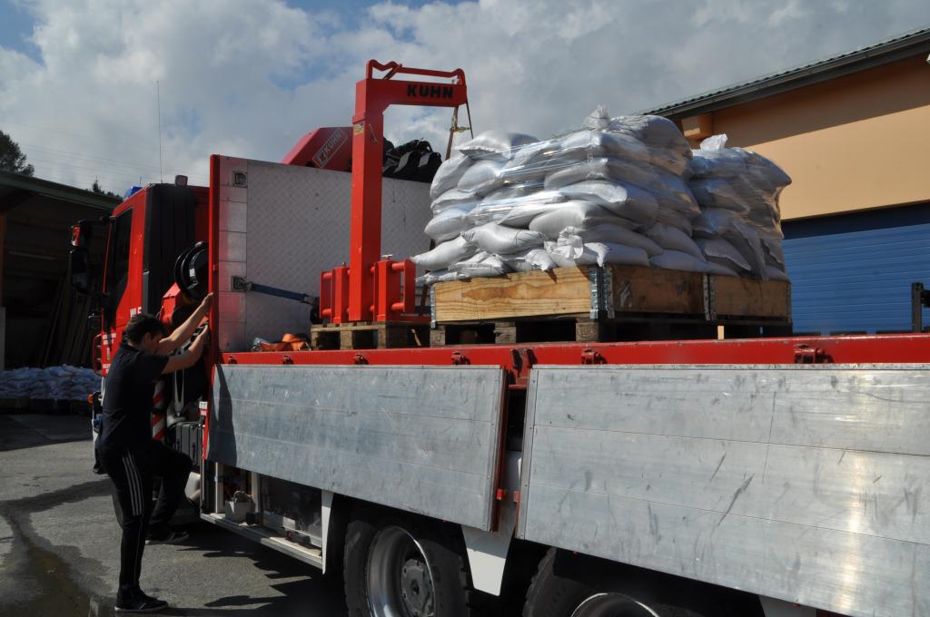 Ein Teil der Paletten mit den gefüllten Sandsäcken wurde mit dem WLF Voitsberg zum Bezirksstützpunkt FF Hallersdorf überstellt, einige Paletten werden bei der FF Afling gelagert und der Rest wird auf die Feuerwehrstandorte aufgeteilt.