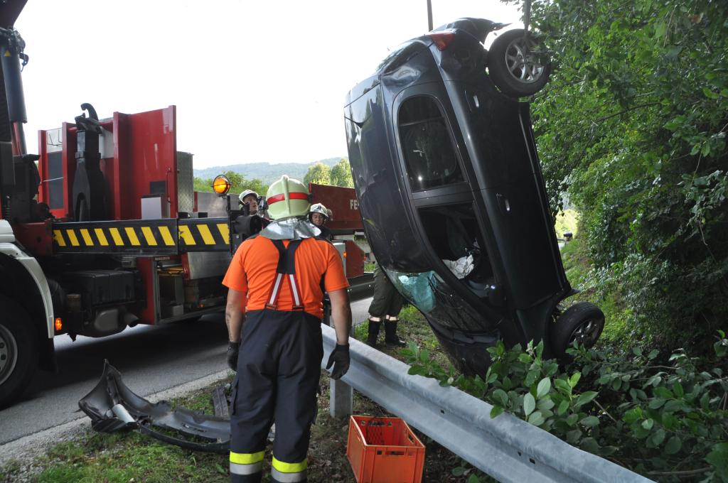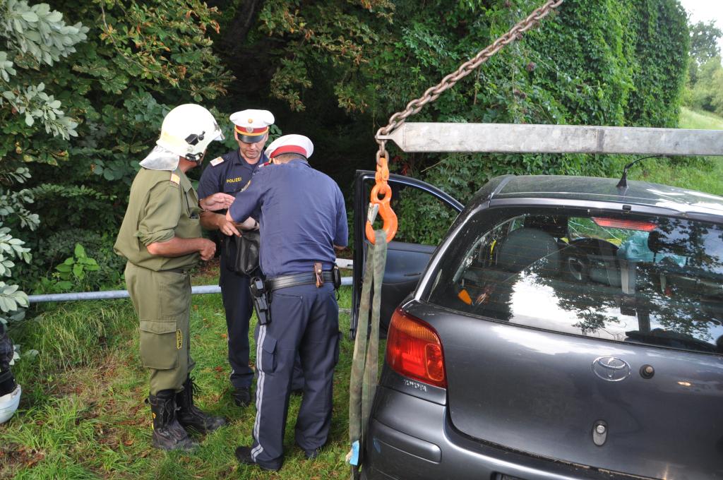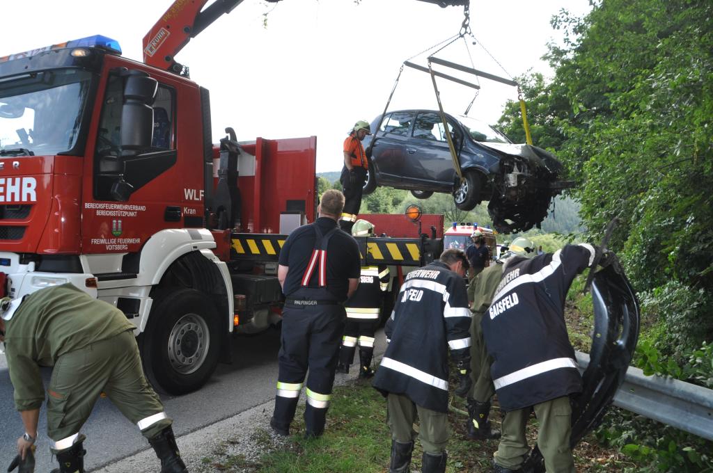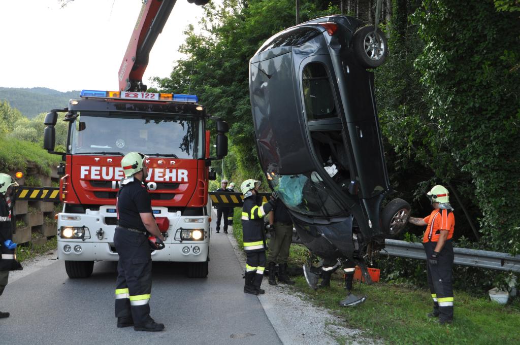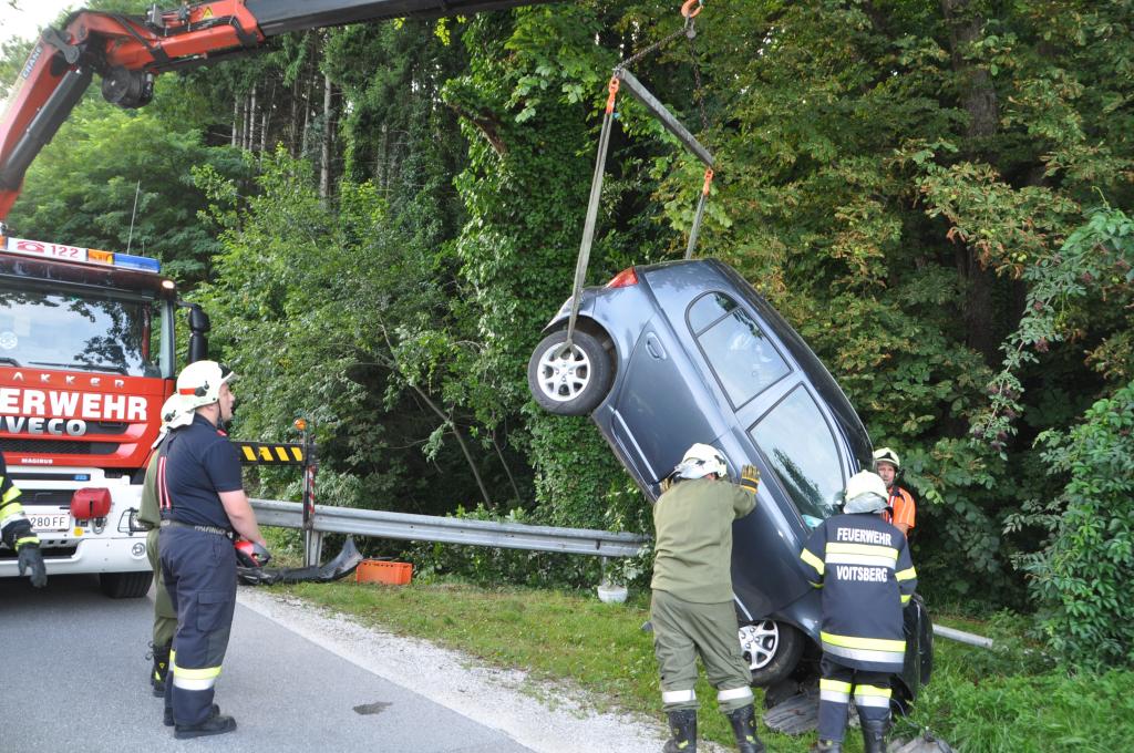VOITSBERG, am 01.08.2015 Nach Anforderung der FF Gaisfeld wurden die Stützpunktfahrzeuge WLF-Kran und das ÖF zu einer Fahrzeugbergung angefordert. Ein PKW kam aus ungeklärter Ursache von einer Gemeindestraße ab, fuhr einen Lichtmast nieder und stürzte sich überschlagend über eine Böschung und kam mit den Rädern in einem kleinen Bach zu stehen. Die sich im Fahrzeug befindlichen Insassen, eine Frau und ein Kind, konnten sich selbst befreien. Das ebenfalls verständigte Rote Kreuz Voitsberg versorgte Beide und lieferte sie ins LKH Voitsberg ein. Der Grad der Verletzung ist unbekannt. Die Feuerwehren Gaisfeld und Voitsberg kontrollierten die Böschung bezüglich ausgetretener Schmiermittel und rückten danach in die Rüsthäuser ein. Die polizeilichen Erhebungen führte die Polizei durch.