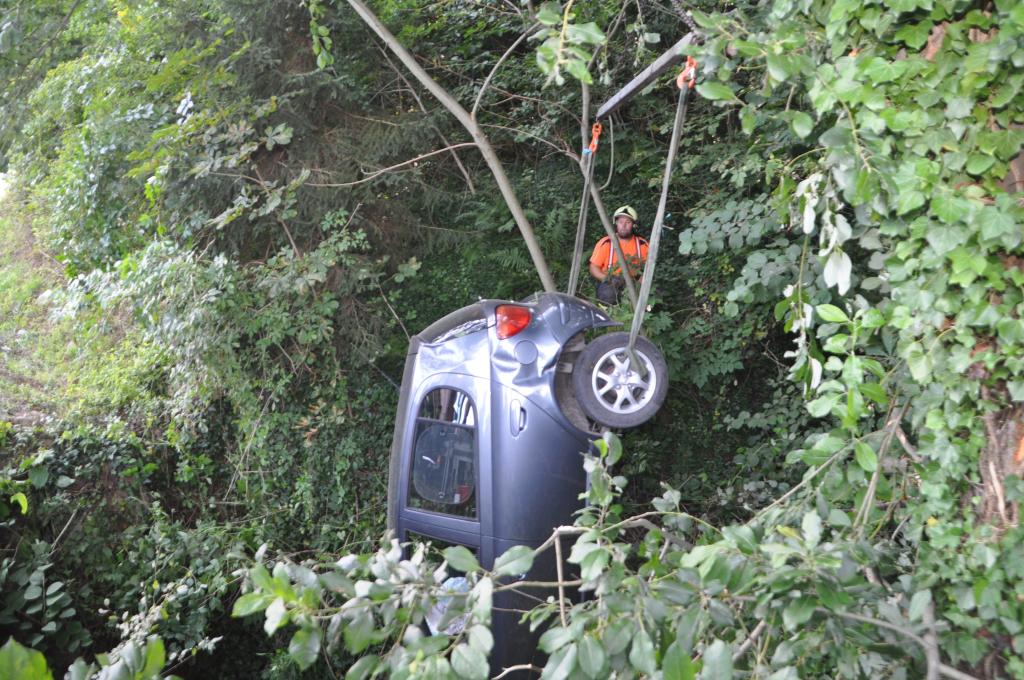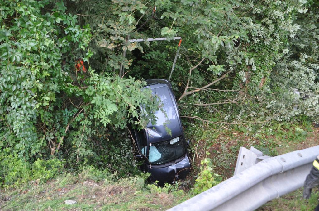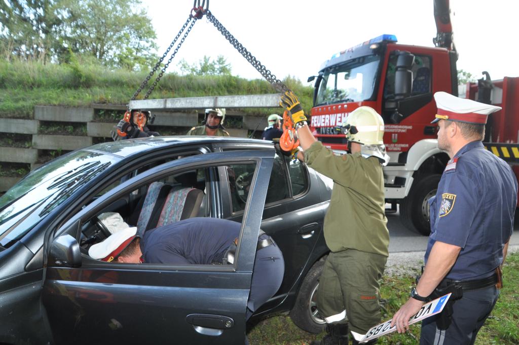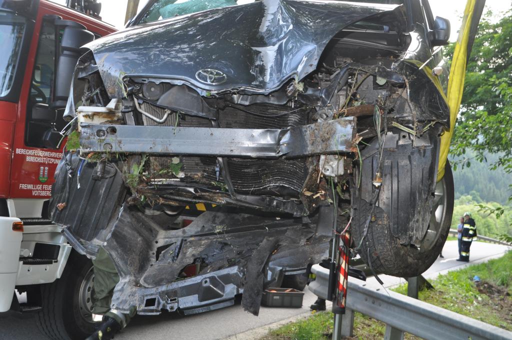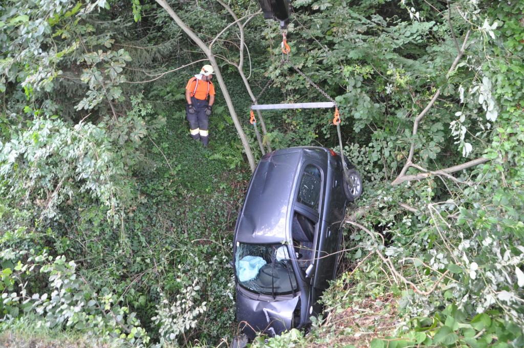 VOITSBERG, am 01.08.2015 Nach Anforderung der FF Gaisfeld wurden die Stützpunktfahrzeuge WLF-Kran und das ÖF zu einer Fahrzeugbergung angefordert. Ein PKW kam aus ungeklärter Ursache von einer Gemeindestraße ab, fuhr einen Lichtmast nieder und stürzte sich überschlagend über eine Böschung und kam mit den Rädern in einem kleinen Bach zu stehen. Die sich im Fahrzeug befindlichen Insassen, eine Frau und ein Kind, konnten sich selbst befreien. Das ebenfalls verständigte Rote Kreuz Voitsberg versorgte Beide und lieferte sie ins LKH Voitsberg ein. Der Grad der Verletzung ist unbekannt. Die Feuerwehren Gaisfeld und Voitsberg kontrollierten die Böschung bezüglich ausgetretener Schmiermittel und rückten danach in die Rüsthäuser ein. Die polizeilichen Erhebungen führte die Polizei durch.