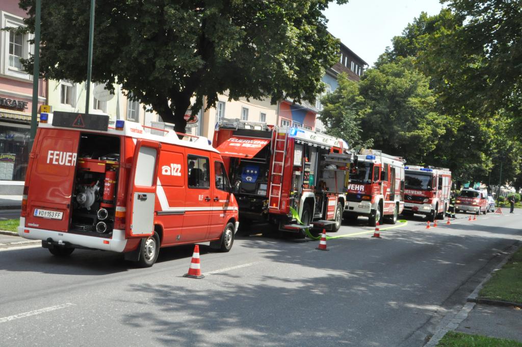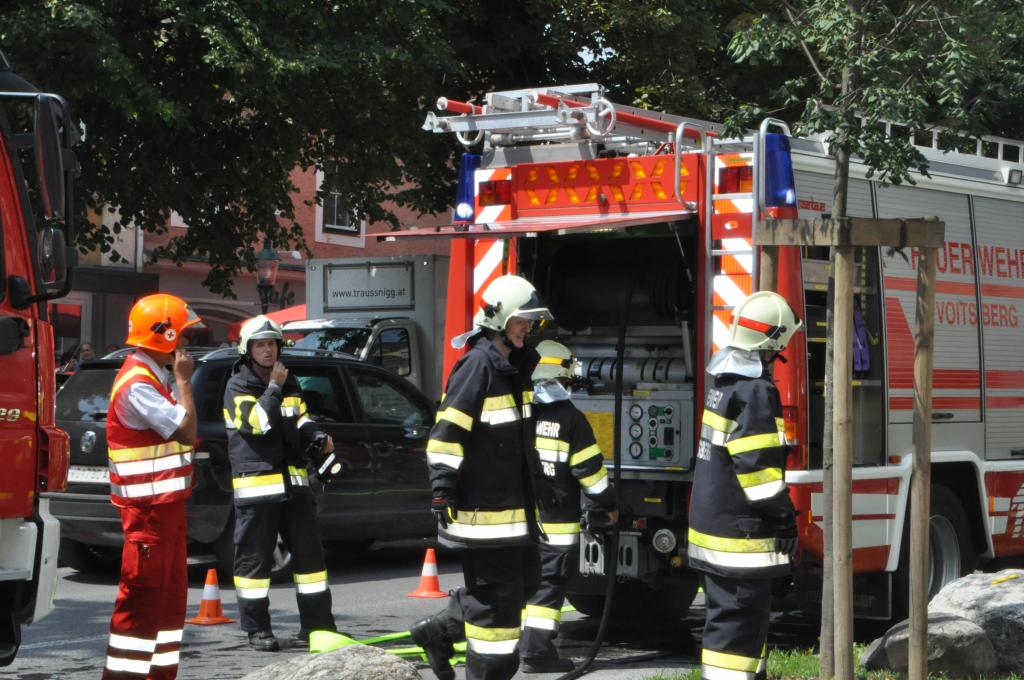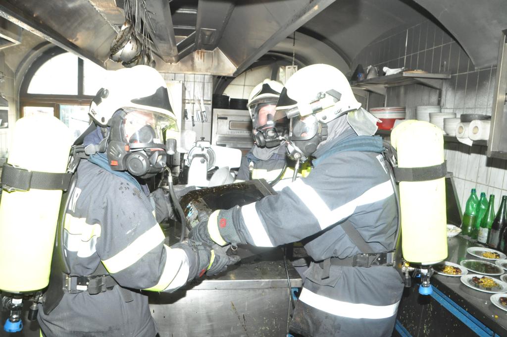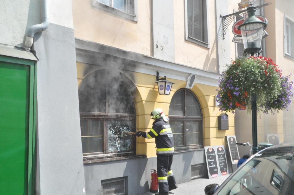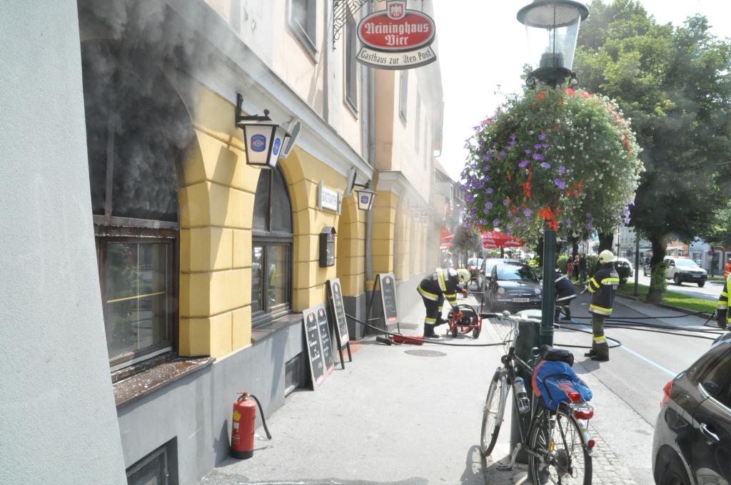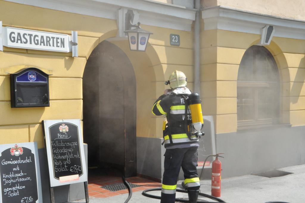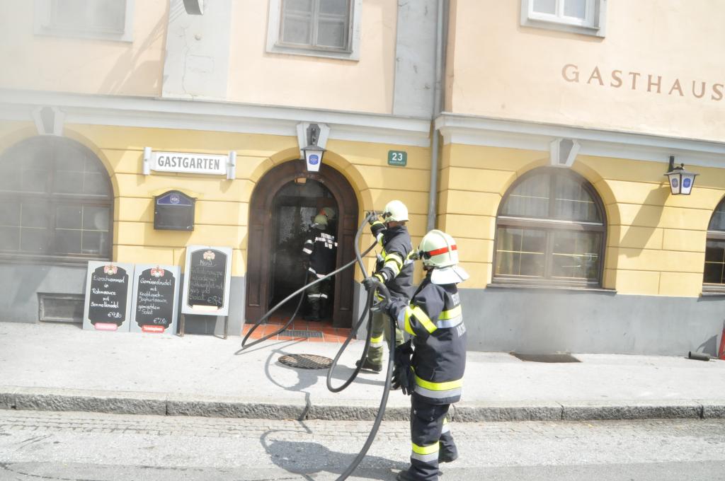 VOITSBERG, am 03.08.2015 Aus unbekannter Ursache brach in der Küche eines Gasthauses am Voitsberger Hauptplatz ein Brand aus. Die sich zahlreich im Gasthaus befindlichen Gäste und das Personal konnten sich selbst retten. Ein Gast versuchte mit Feuerlöschern den Brand zu bekämpfen, erlitt eine leichte Rauchgasvergiftung und wurde mit dem Roten Kreuz in das LKH Voitsberg eingeliefert, konnte es aber kurze Zeit später wieder verlassen. Die Aufgabe der Feuerwehren war der Brandangriff unter schwerem Atemschutz mit zwei Trupps und die Belüftung des Lokals mit zwei Drucklüftern. Letztlich wurde mit einer Wärmebildkamera die gesamte Küche kontrolliert.