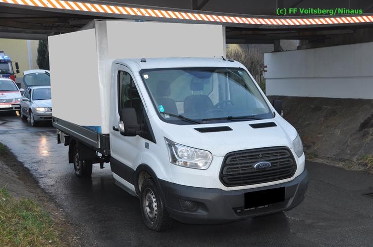 VOITSBERG, am 17.12.2015 Nachdem ein Lenker mit einem Leih-Kleintransporter die Bahnunterführung mit einer Maximalhöhe von 2,60 Meter unterschätzte, blieb er mit dem Aufbau unter der Brücke stecken und konnte weder vor noch zurück. Es wurde versucht, mittels Luftablassen das Fahrzeug zu bergen, was aber misslang. Die alarmierte FF Voitsberg lockerte den Aufbau, beschwerte die Ladefläche mit Mannes(Frauen)kraft und fuhr den Wagen unter der Brücke heraus. Nachdem mittels Kompressor des HLF 3 Tunnel der Reifendruck wieder hergestellt wurde, konnte der Lenker die Fahrt wieder fortsetzen. Am Fahrzeug und an der Brücke entstand leichter Sachschaden. Die GKB wurde seitens der Polizei verständigt.