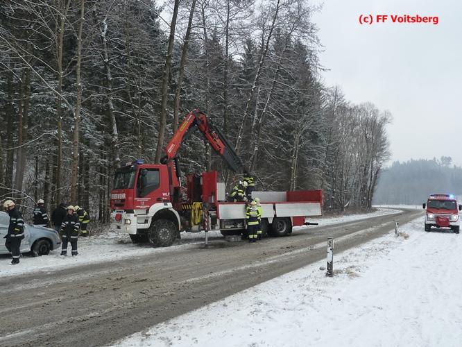 VOITSBERG, am 03.01.2016 Ein PKW kam aus ungeklärter Ursache ins Schleudern, kam von der Landesstrasse ab und landete seitlich liegend in einem Bach. Die alarmierte FF Piber führte Erstmaßnahmen durch und forderte über die LLZ Steiermark das WLF-Kran der FF Voitsberg zwecks Bergung an. Der Verkehr wurde während der Bergungsarbeiten von der FF Piber geregelt.