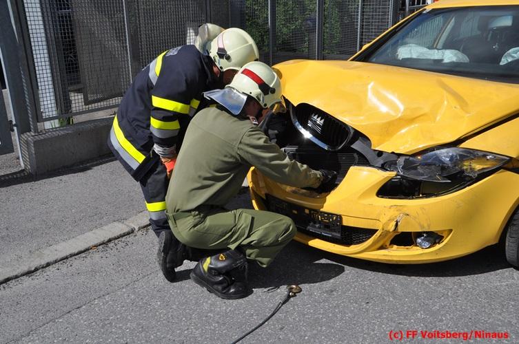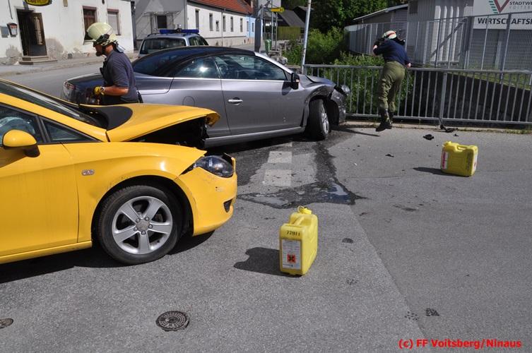 VOITSBERG, am 30.05.2016 Am Montagvormittag kam es auf der Kreuzung Zangtalerstrasse - Burggasse in Voitsberg zu einem Zusammenstoß zweier PKW. Die beschädigten Fahrzeuge wurden von der FF Voitsberg von der Unfallstelle entfernt und herumliegende Wrackteile beseitigt. Ausgeflossene Betriebsmittel wurden gebunden und fachgerecht entsorgt. Verletzt wurde niemand.