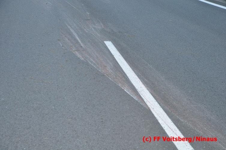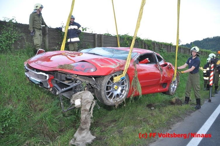 VOITSBERG, am 10.06.2016 Vermutlich wegen überhöhter Geschwindigkeit kam ein PKW auf der LB 70 im Gemeindegebiet Krottendorf in Fahrtrichtung Graz ins Schleudern, geriet auf die rechte Straßenböschung, überschlug sich und schlitterte am Dach ca. 90 Meter auf die linke Straßenseite. Danach stürzte das schwer beschädigte Fahrzeug auf die Straßenböschung und kam neben dem linken Straßenrand zu stehen. Die Wegstrecke, an der sich der Unfall ereignete, wurde seitens der Polizei mit ca. 200 Meter angegeben. Der Lenker und ein Beifahrer hatten riesiges Glück und konnten leicht verletzt aus dem Sportwagen aussteigen, wurden vom Roten Kreuz Voitsberg erstversorgt und danach ins LKH Voitsberg eingeliefert. Das Unfallwrack wurde mit dem WLF-Kran der FF Voitsberg geborgen und von der Unfallstelle entfernt. Ausgelaufene Betriebsmittel wurden seitens der FF Gaisfeld gebunden und fachgerecht entsorgt. Herumliegende Wrackteile wurden von der FF Krottendorf eingesammelt. Die Verkehrsregelung oblag den Wehren Gaisfeld und Krottendorf in Zusammenarbeit mit der Polizei. Man kann wiederum von großem Glück sprechen, dass zum Zeitpunkt des Unfalles auf der sonst sehr stark befahrenen Bundesstraße kein Gegenverkehr herrschte.
