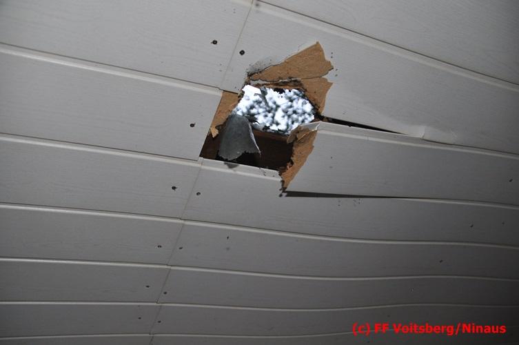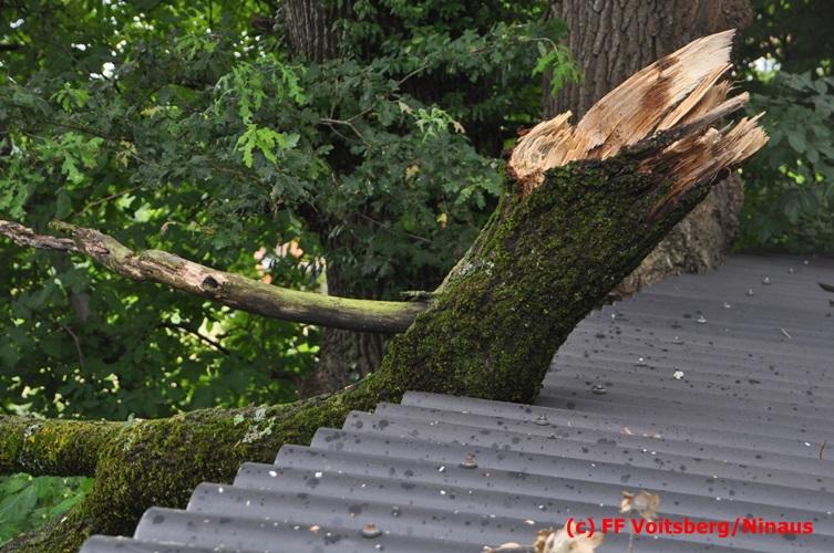 VOITSBERG, am 05.08.2016 Nach einem Sturm fielen Baumteile und Äste auf die Stromleitung eines Wohnhauses. Es bestand Gefahr in Verzug, da sich weitere Baumteile anstellten, abzubrechen. Ein Zutritt zum Grundstück war deshalb sehr gefährlich und nicht verantwortbar, sodass Kameraden mit Hilfe des WLF-Korbes den fast 100 Jahre alten Baum von den morschen Ästen befreiten. Der Inspektionsdienst der Stadtwerke Voitsberg musste während der Schneidearbeiten den Strom in diesem Gebiet für einige Stunden abschalten.