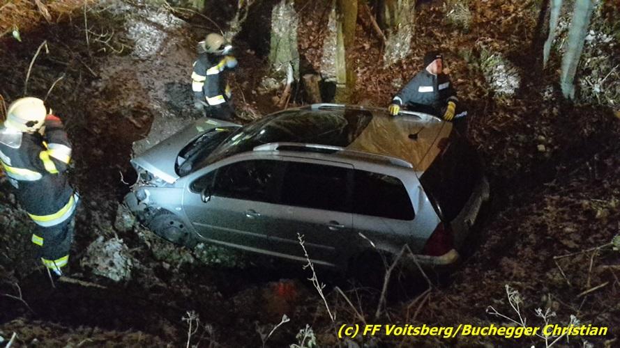 VOITSBERG, am 22.12.2016 Ein PKW kam in einer scharfen Kurve von der Fahrbahn ab und stürzte ca. 3 m tief in den Straßengraben. Der Lenker wurde mit Verletzungen unbestimmten Grades ins LKH Voitsberg eingeliefert. Am Fahrzeug entstand Totalschaden. Die Bergung erfolgte mit dem WLF-Kran der FF Voitsberg in Zusammenarbeit mit der FF Kainach.
