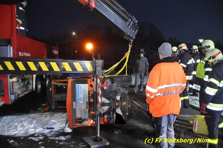 Ein Streufahrzeug geriet von einer Gehsteigkante ab, stürzte um und kam seitlich zu liegen. Der Lenker blieb unverletzt. Die Bergung erfolgte mit dem WLF-Kran. Ausgeflossene Betriebsmittel wurden gebunden.
