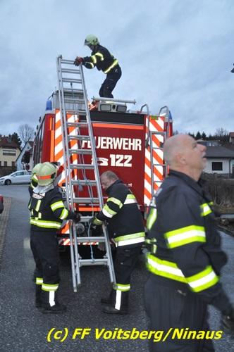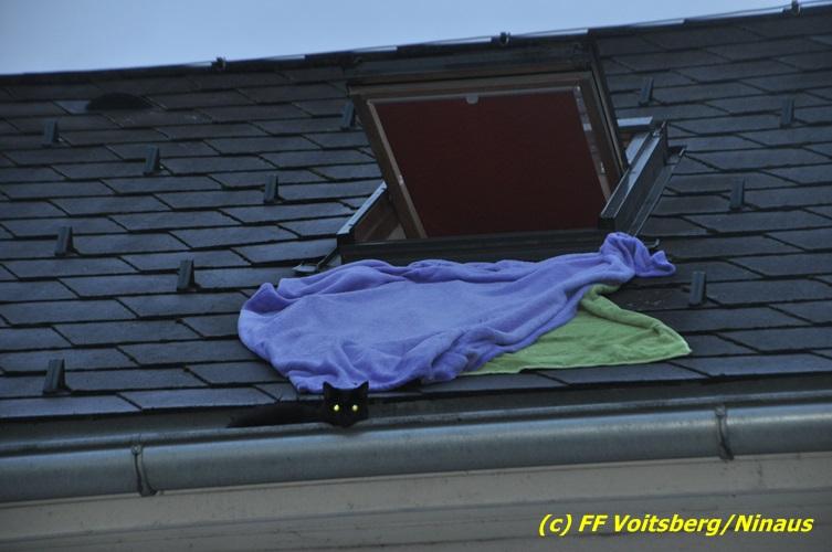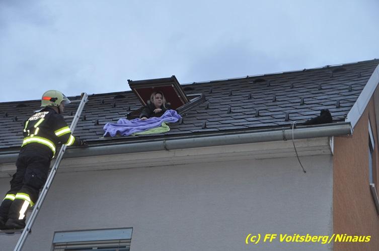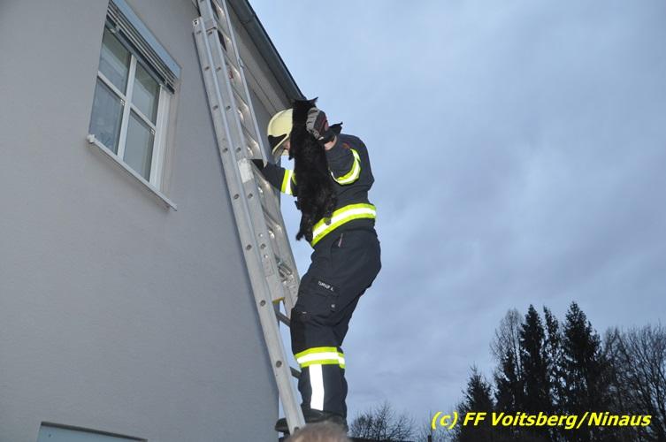 VOITSBERG, am 01.03.2017 Eine Katze geriet aus unerklärlichen Gründen durch ein Fenster einer Dachgaube im dritten Obergeschoss auf das Dach und rutschte in eine Dachrinne. Die Besitzer versuchten mit Tüchern einen Rückweg für das Tier herzustellen, was aber von der Katze nicht angenommen wurde. Über die LLZ Steiermark wurde die FF Voitsberg zur Tierrettung alarmiert. Über eine Schiebeleiter wurde das verängstigte Tier schlussendlich von einem Kameraden eingefangen und zu Boden gebracht. Bei der Rettung wurde der Kamerad von der Katze im Gesicht leicht verletzt. Der überglückliche Mitbesitzer konnte das nervöse, aber unverletzte Tier von der Feuerwehr übernehmen und den Dank an die Einsatzkräfte aussprechen.