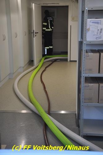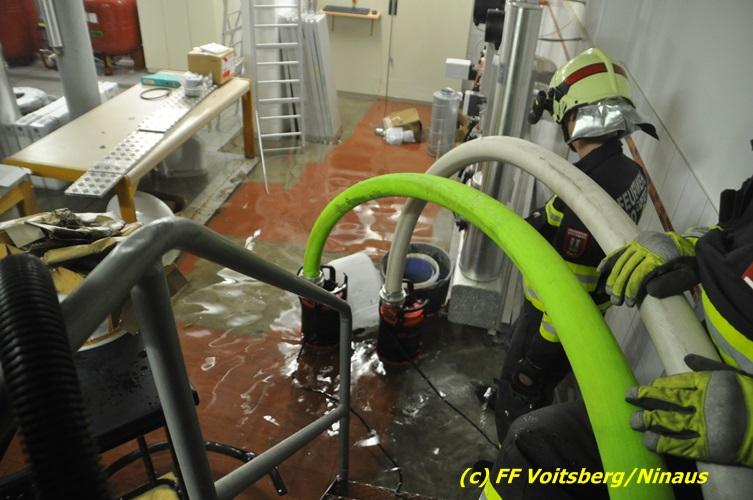 Nach einem Wasserrohrbruch war der Technikraum des Bezirks-Pflege- und Seniorenheimes am Voitsberger Schlossberg ca. 60 cm unter Wasser. Auspumpen des fast 70m2 großen Raumes mit zwei Hochleistungspumpen sowie Absaugen mit Nasssaugern. Nach dem raschen Einsatz der FF Voitsberg und der Reparatur durch eine Fachfirma konnte der Betrieb im Haus nach kurzem Ausfall wieder unter normalen Umständen aufgenommen werden. Bewährt hat sich der neu angeschaffte LKW-A mit den Containern für solche Wassereinsätze. Wasserinstallationsfirma und Stadtwerke Voitsberg anwesend.