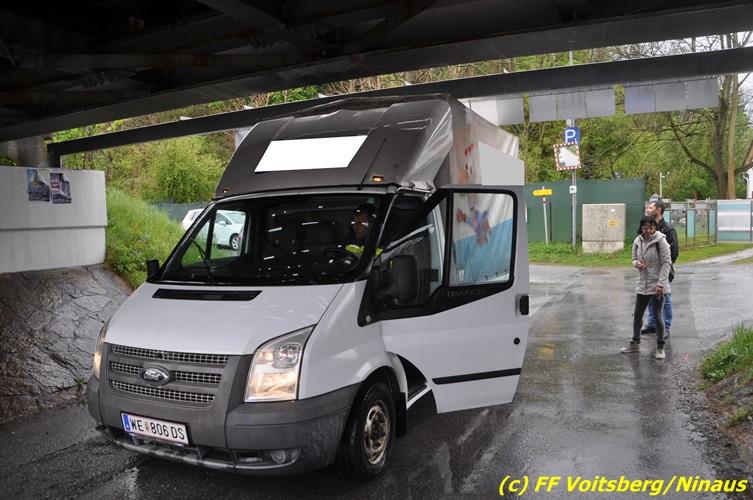 Ein Lenker eines Kleintransporters unterschätzte die Höhe einer Eisenbahnunterführung in der Greißeneggerstrasse und blieb darunter stecken. Da er weder nach vor noch zurück fahren konnte verständigte er über die LLZ Steiermark die FF Voitsberg. Die ausgerückte Mannschaft ließ beim Fahrzeug Luft ab, beschwerte das Fahrzeug mit Feuerwehrleuten und fuhr das Fahrzeug aus der misslichen Situation. Sodann wurde per Kompressor wieder der Luftdruck bei den Reifen hergestellt, sodass die Fahrt ohne Schaden fortgeführt werden konnte.