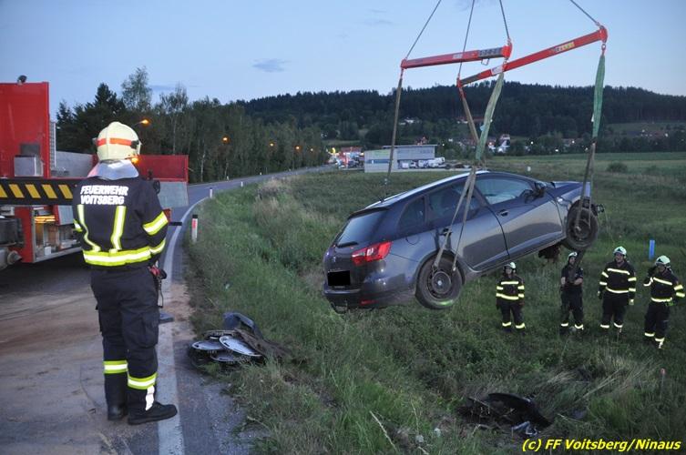Aus ungeklärter Ursache kollidierten zwei PKW, wobei ein Fahrzeug über eine 5 m hohe Böschung geschleudert wurde. Beide Fahrzeuge wurde schwer beschädigt. Ein Lenker wurde mit dem Roten Kreuz nach der Erstversorgung in ein Krankenhaus mit Verletzungen unbestimmten Grades eingeliefert. Der zweite Lenker konnte nach der Erstversorgung von der Notärztin nach Hause entlassen werden. Zur Bergung beider Fahrzeuge wurde das WLF-Kran der FF Voitsberg nachalarmiert. Die Spange war für ca. 1 Stunde für den gesamten Verkehr gesperrt. Die Polizei führte die Unfallerhebungen durch.