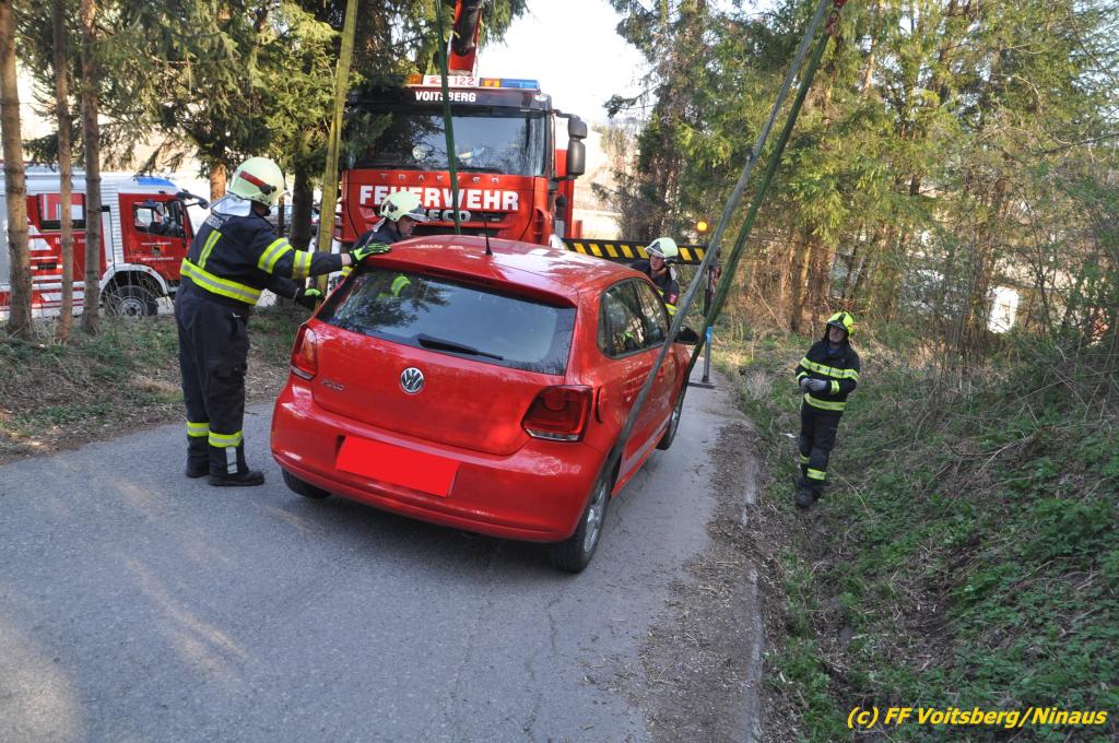 VOITSBERG, am 31.03.2019 Am Sonntag, 31. März 2019 geriet in den Nachmittagsstunden ein PKW auf einer Gemeindestrasse in Bärnbach von der Straße ab und kam in einer Regenrinne zu stehen, wobei das Fahrzeug mit der Bodenplatte aufsaß. Die alarmierte FF Bärnbach sicherte die Unfallstelle ab und forderte zur Bergung das WLF-Kran der FF Voitsberg an. Das Fahrzeug wurde unbeschädigt geborgen und konnte die Fahrt auf eigener Achse fortsetzen. Verletzt wurde niemand. Eingesetzte Kräfte unter Einsatzleiter OBI Michael Witreich FF Bärnbach mit 15 Kräften FF Voitsberg mit 8 Kräften Text und Fotos: Walter Ninaus, FF Voitsberg