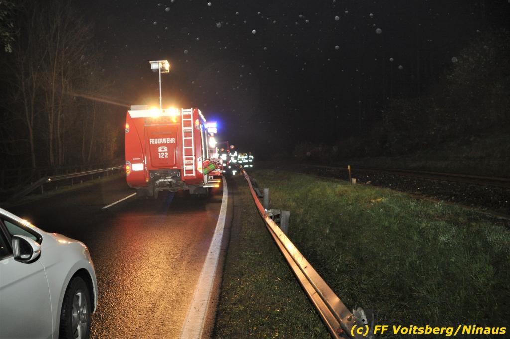VOITSBERG, am 01.11.2019 Die FF Voitsberg wurde am Freitag, 1. November 2019 kurz nach 2 Uhr seitens der einsatzleitenden FF Krems zu einer Fahrzeugbergung in den Kremser Reihen Fahrtrichtung Graz in Voitsberg zwecks Unterstützung nachalarmiert. Ein von der B 70 abgekommener PKW geriet auf eine Leitschiene, wurde ca. 30 m durch die Luft geschleudert, überschlug sich einige Male und kam neben der Bahngleise der GKB zu stehen. Die Bergung erfolgte mit dem WLF-Kran der FF Voitsberg. Da Betriebsmittel aus dem schwer beschädigten Fahrzeug ausflossen, wurde dieser auf einen gesicherten Platz abgestellt. Der Lenker wurde mit Verletzungen unbestimmten Grades in ein Krankenhaus eingeliefert. Die FF Krems übernahm die Einsatzleitung, sicherte die Unfallstelle ab, baute einen Brandschutz auf, band ausgelaufene Betriebsmittel und sammelte herumliegende Wrackteile ein.