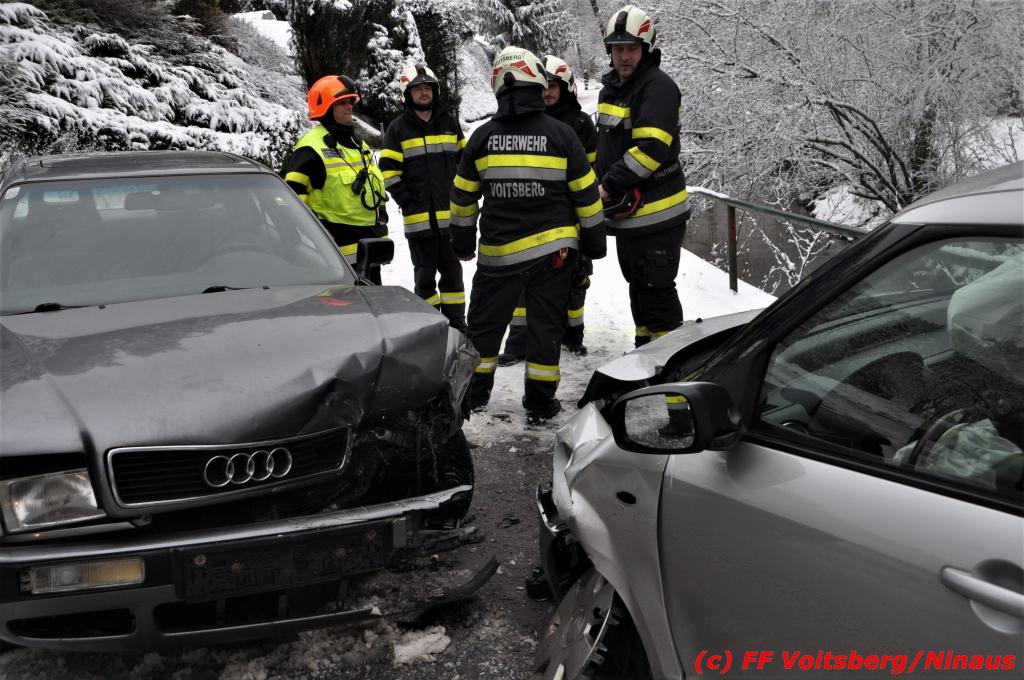 VOITSBERG, am 14.12.2019 Am Samstag, 14. Oktober 2019 in den Vormittagsstunden kam es aus unbekannter Ursache auf der schneeglatten Gößnitztalstraße im Gemeindegebiet Rosental zu einem Zusammenstoß zweier Pkw. Beide Fahrzeuge wurden schwer beschädigt und blockierten die Straße. Drei in den Fahrzeugen befindliche Personen wurden mit Verletzungen unbestimmten Grades in das LKH Voitsberg eingeliefert. Zwecks Bergung und Binden auslaufender Betriebsmittel wurde die FF Rosental seitens der LLZ alarmiert, welche nach Erkundung durch den Einsatzleiter zwecks Bergung beider Fahrzeuge das WLF-Kran der FF Voitsberg nachalarmieren ließ. Die FF Rosental sicherte die Unfallstelle ab, baute einen Brandschutz auf, regelte den Verkehr und band ausgelaufene Betriebsmittel. Beide Fahrzeuge wurden mit dem WLF-Kran und dem Mehrzweckanhänger der FF Voitsberg zu einem gesicherten Platz überstellt. .